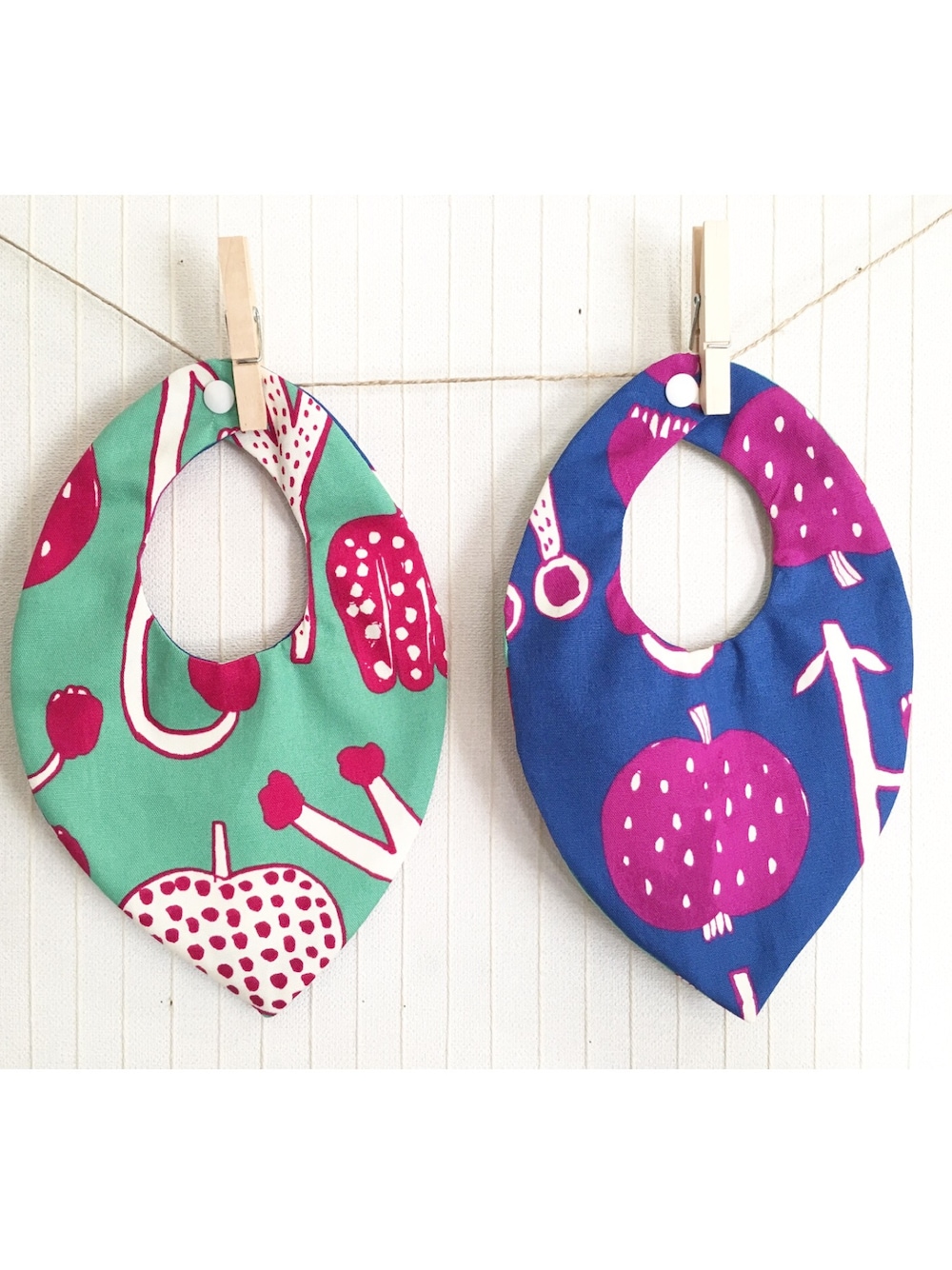 ✴︎minneで販売中✴︎ ブルー×グリーンの北欧柄の生地を使ったスタイ☆彡 どちらもコーディネイトの主役になる可愛い柄です♬ フリーサイズ(首周り30cmくらい。) プラスチックのスナップボタン。 コットン100%