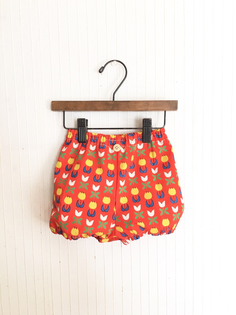 ✴︎minneで販売中✴︎ チューリップのイラストの生地を使ったかぼちゃパンツ。 可愛いイラストのパンツなのでコーディネートの主役になります。 コットン100%。 1点もの商品です♡ 冬はレギンスやタイツと合わせて、夏は1枚でオールシーズン着回せます。 シルエットの可愛いかぼちゃパンツは、動きやすくてはいはいや歩き出す子にぴったりです。ウエストと足周りがゴムで半年~2歳くらいまで長く着回せます。 ウッドボタン付き。