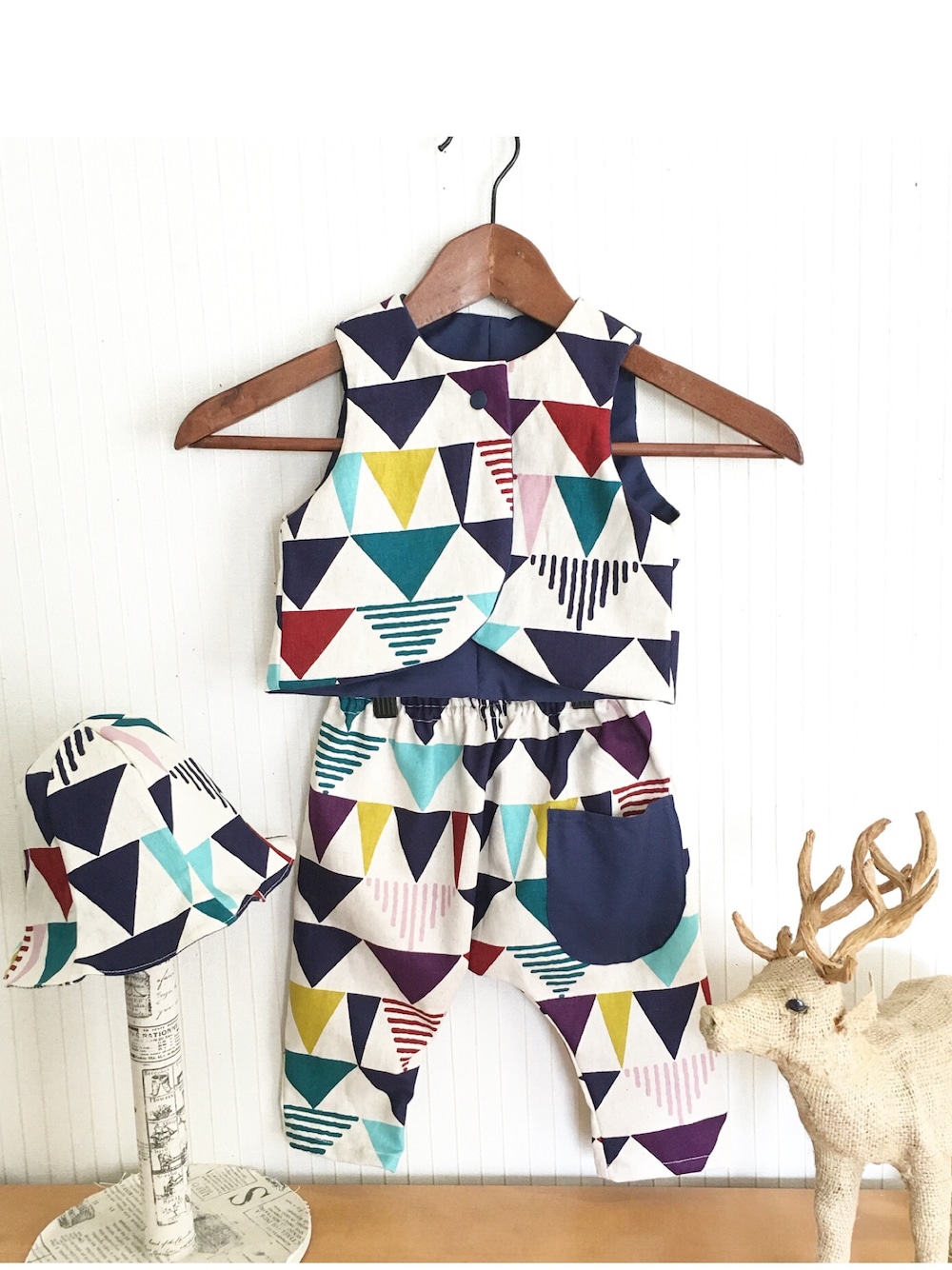 ✴︎minneで販売中✴︎ さんかく柄の生地で制作しました! かぼちゃパンツなども販売してます♡