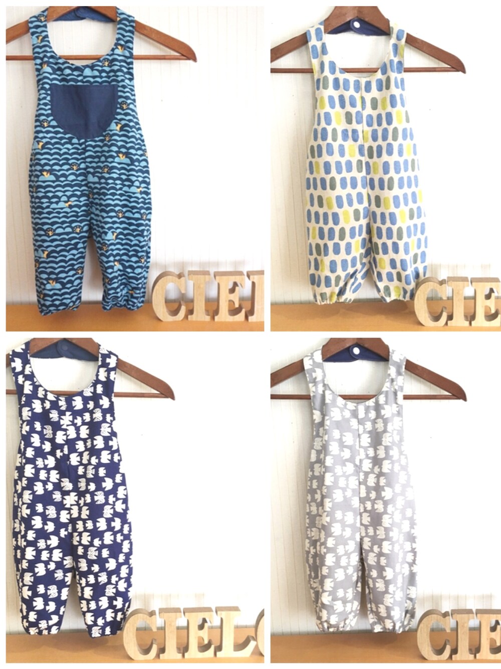 いろいろな生地で制作したサロペットです♫♩ 動き回るはいはい期から着せやすいパンツタイプで、首後ろのスナップボタンをとめるだけなので重ね着していてもオムツ替えができます☻☻ 背中と足周りがゴムのゆったりとしたデザインではいはい期~2歳くらいまで長い間着ていただけます♫