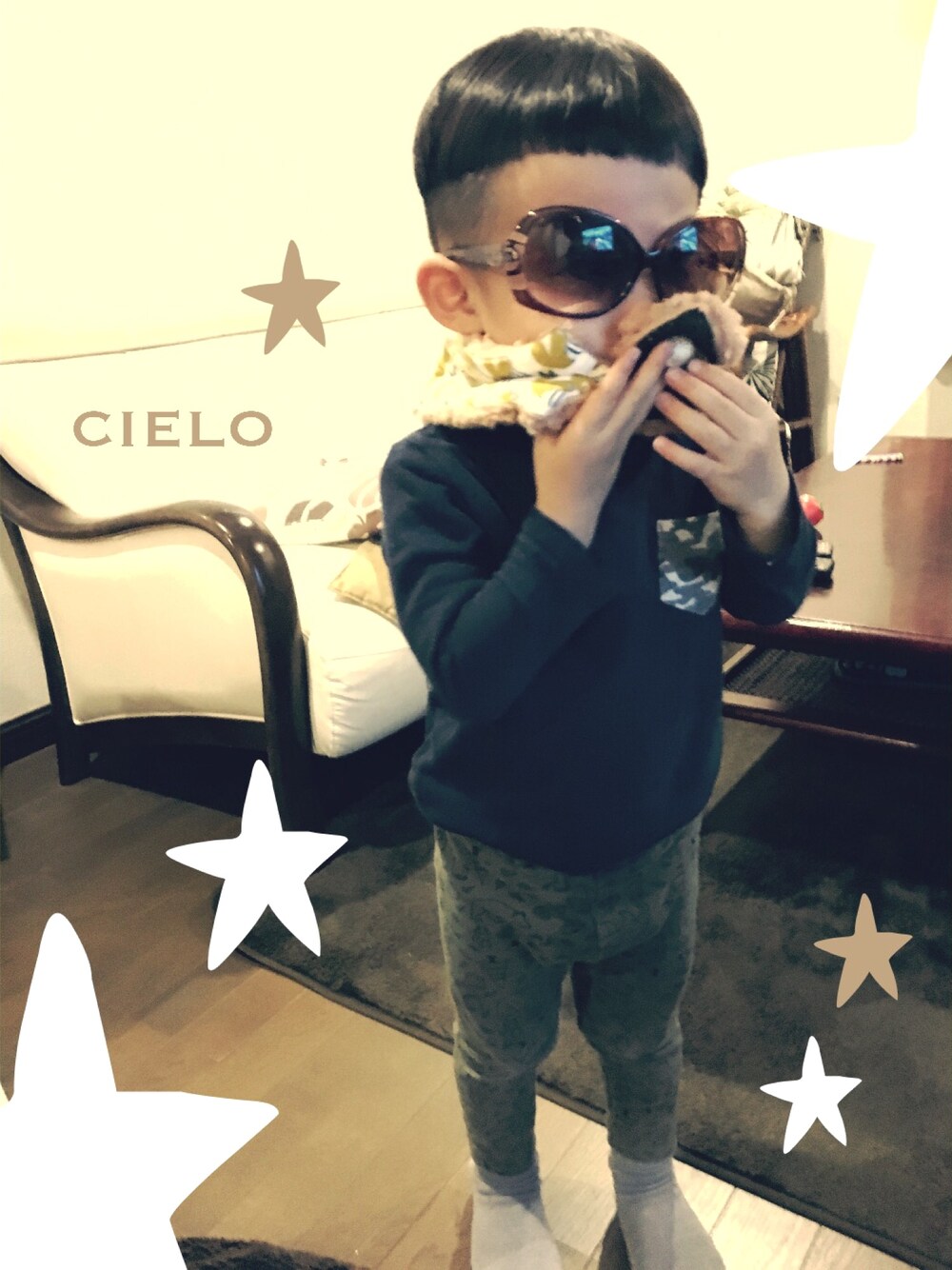 イエロー系のマフラーを着用したキッズの冬コーディネートの1枚目の写真