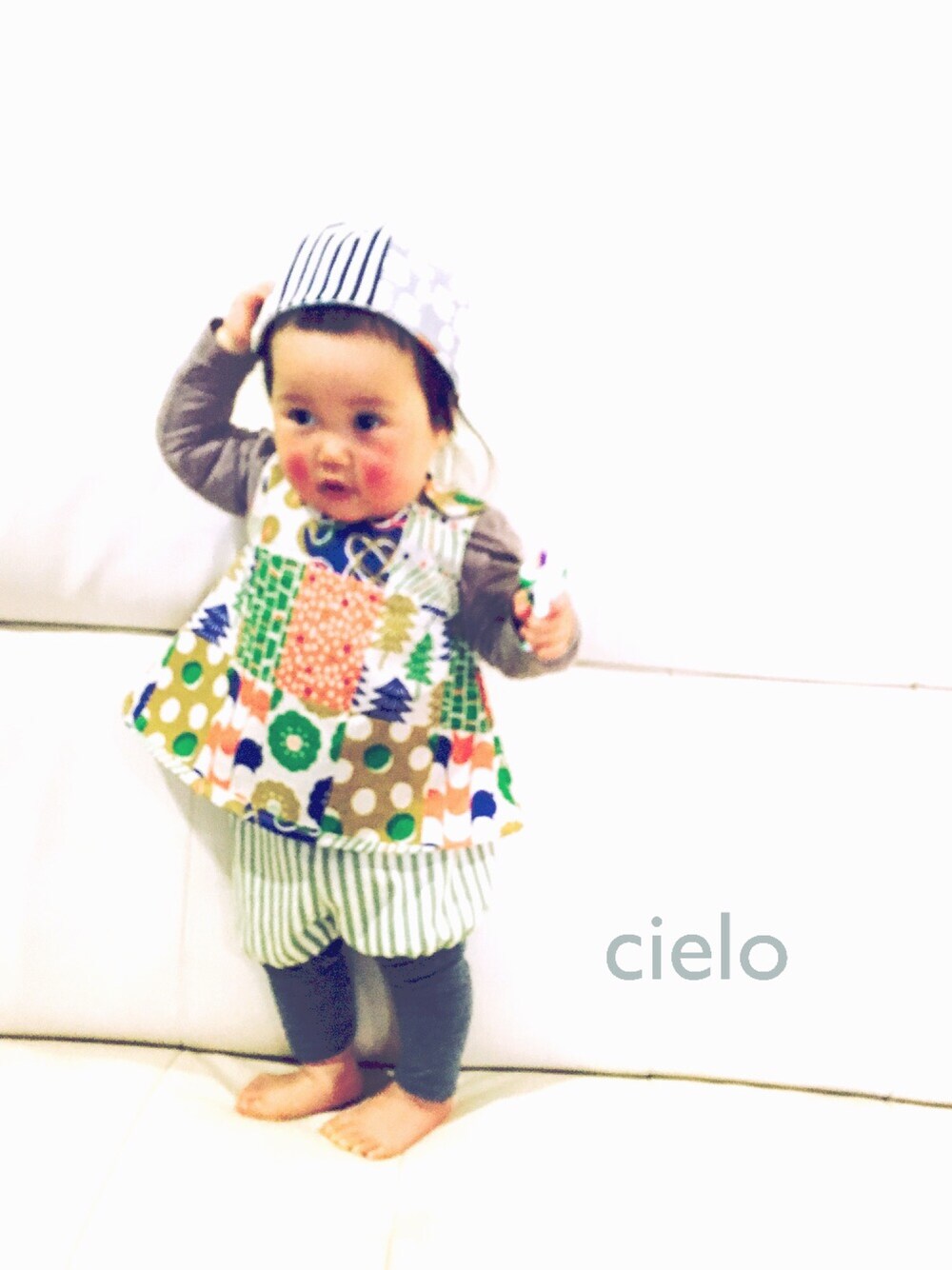 春の新作にチュニックを作ってみましたー♪ かぼちゃパンツと帽子もハンドメイドです♡ cieloトータルコーデ♪(´ε` )