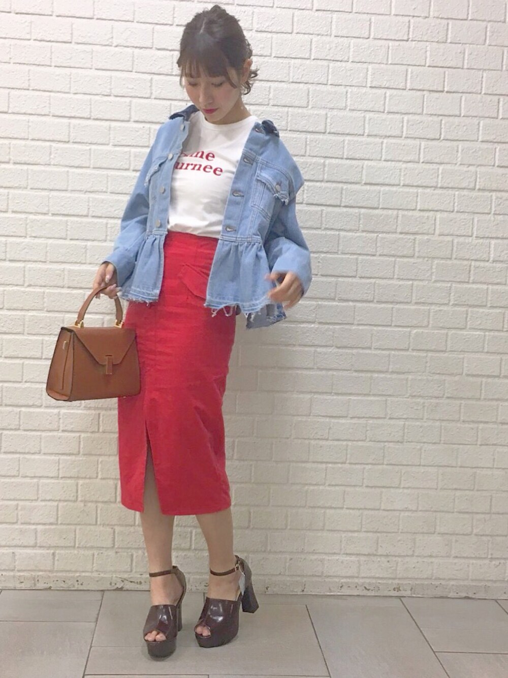トレンドのロゴTとGジャンを使って カジュアルコーデに❤︎ 綺麗なレッドはすごく映えます☺️ Gジャンはペプラム仕様ですごく可愛いデザインです✌️💓