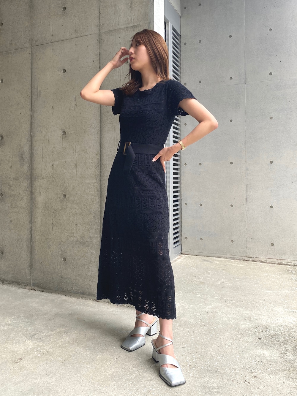 透かし編みデザインの大人っぽワンピース。 足元はシルバーを合わせて、品のあるコーデにしました。 instagram @chiko_sugawara