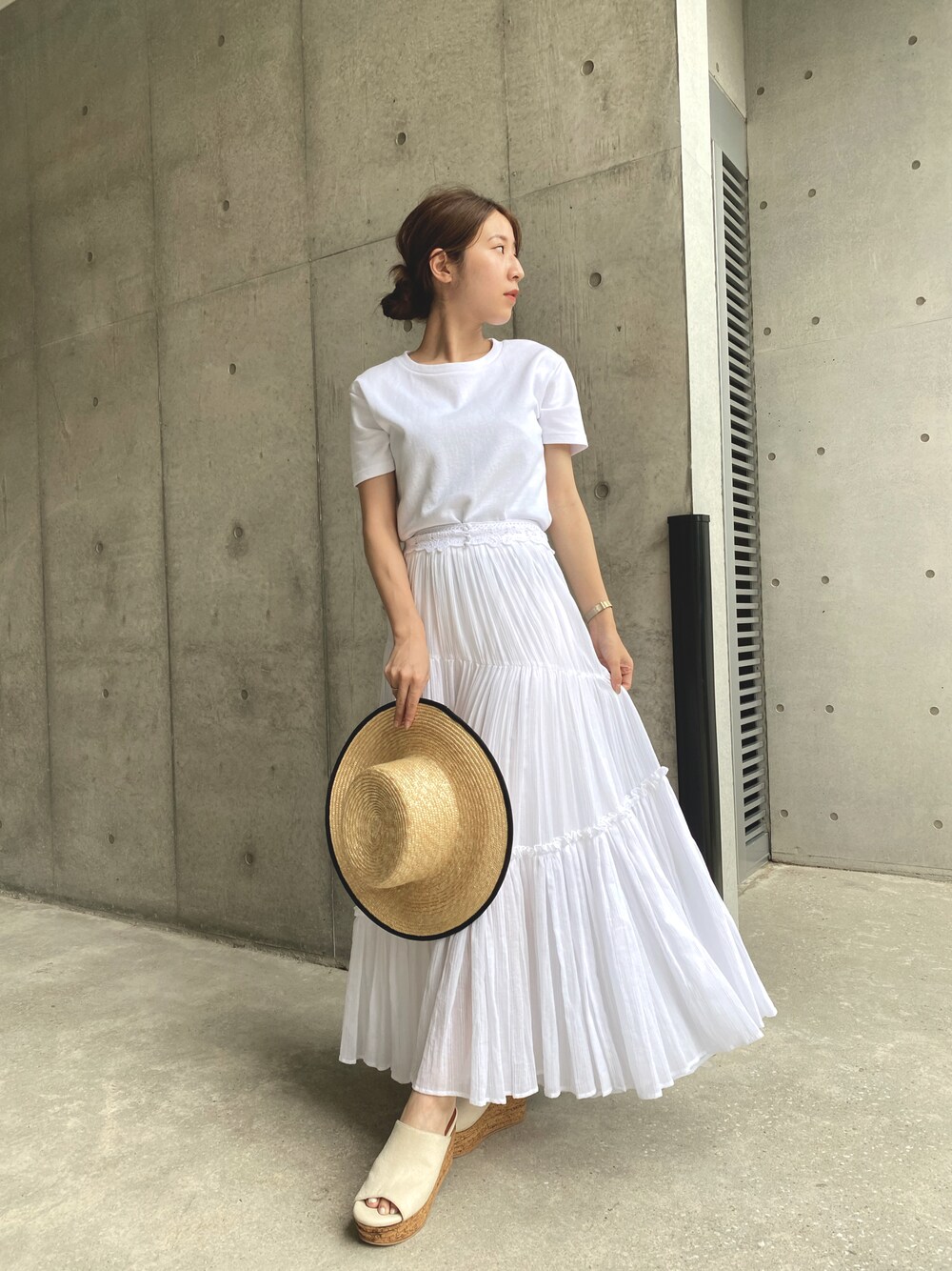 夏のall whiteコーデ🤍 小物はベージュで統一させて、大人っぽくしました🌿 instagram @chiko_sugawara