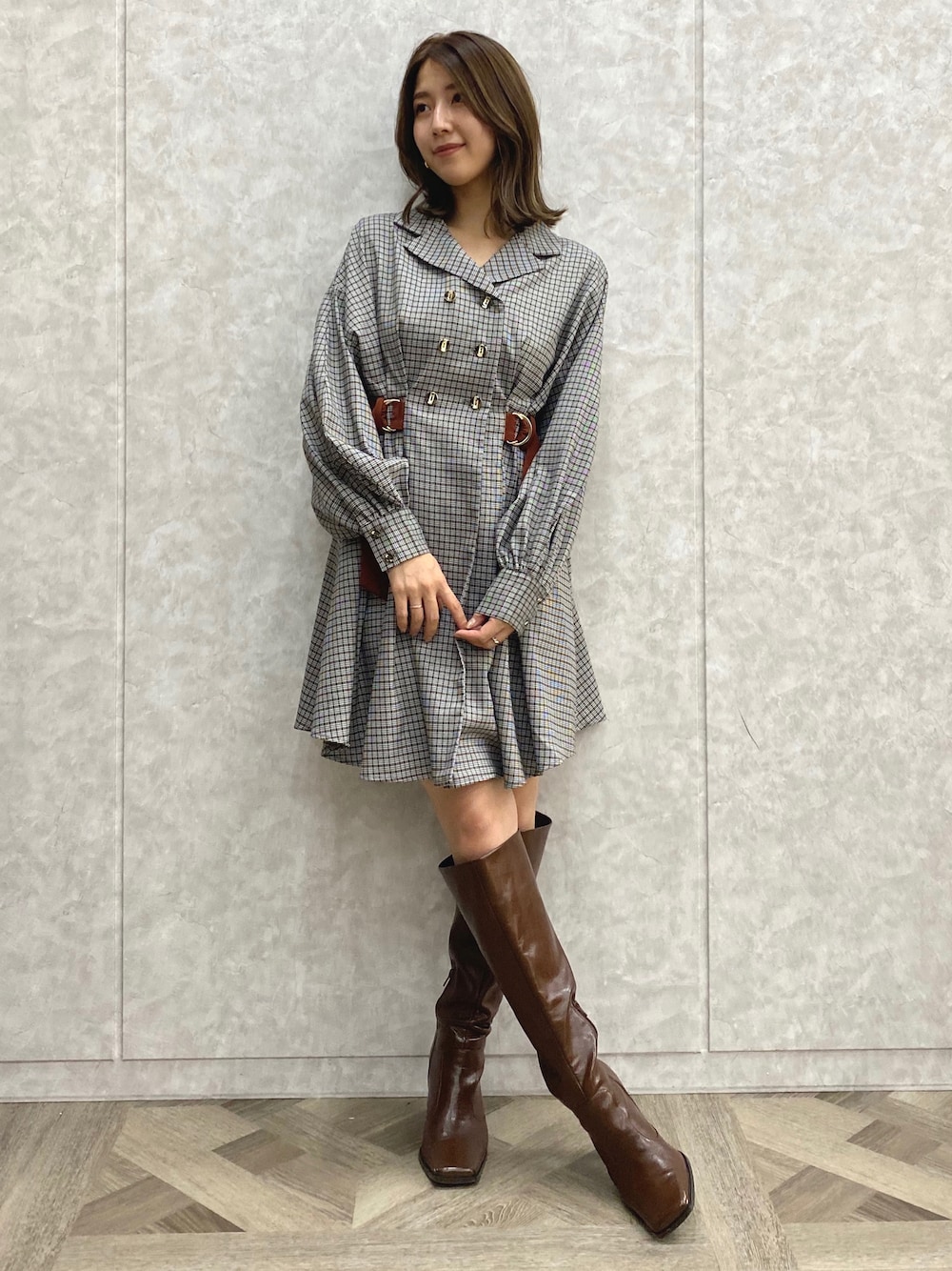 chicoのワンピース「チェックダブルボタンミニシャツワンピース」を使ったコーディネート