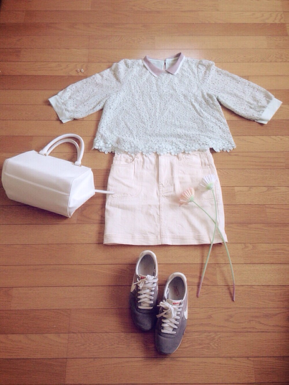 Tops•••••flower Skirt•••••nusy Bag••••••Te chi chi Shoes•••NIKE Pierce•••flower ピアスも春色🌸 春は淡い色が着たくなります:) Finally Spring has come🌷
