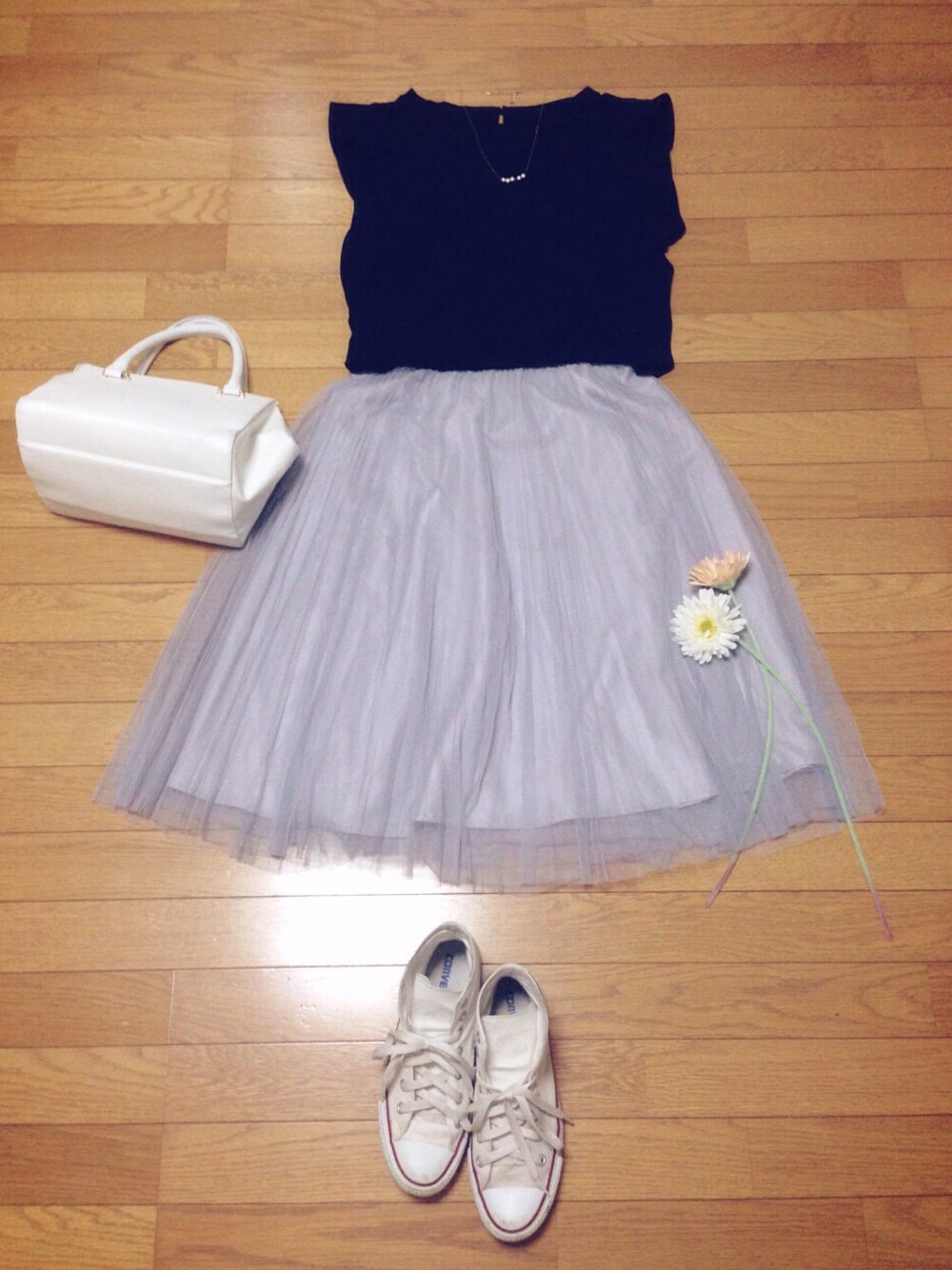 Tops••••••haco. Skirt••••••AG by Aquagirl Bag•••••••Te chi chi Shoes••••CONVERSE +パールネックレス&パステルピアス&ハートリング💎 ゆるーいポニーテールで休日おでかけ☻ ガーリーな服装にスニーカーを組み合わせるのがとても好き👟 Spring stroll!🌸Although always tutu makes us lovely n adorable... wanna be cool n relaxed wearing black blouse n sneakers this spring👟