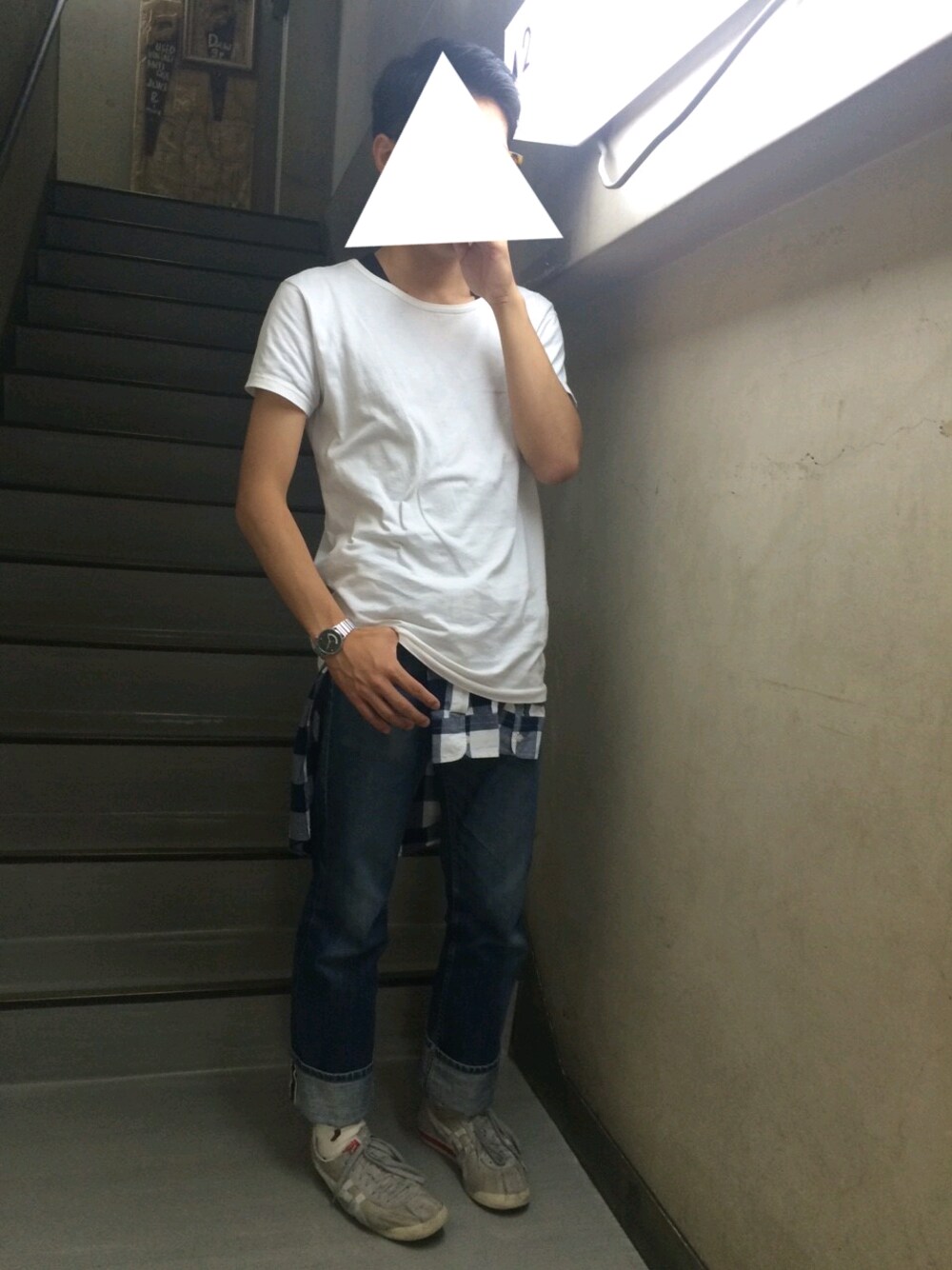 あれ、身長低く見える...(っ ´-` c) 170前半はあるのに(っ ´-` c) すみません、着回しですね! 撮るぞって時に限って同じ服着てるんですよね! 言い訳ですが。。 デニムとチェックシャツの色合いが涼しげですね! ロールアップも大きめにしました。 夏らしいシンプルな格好いいですね。 モッズはどうしたんでしょう。。