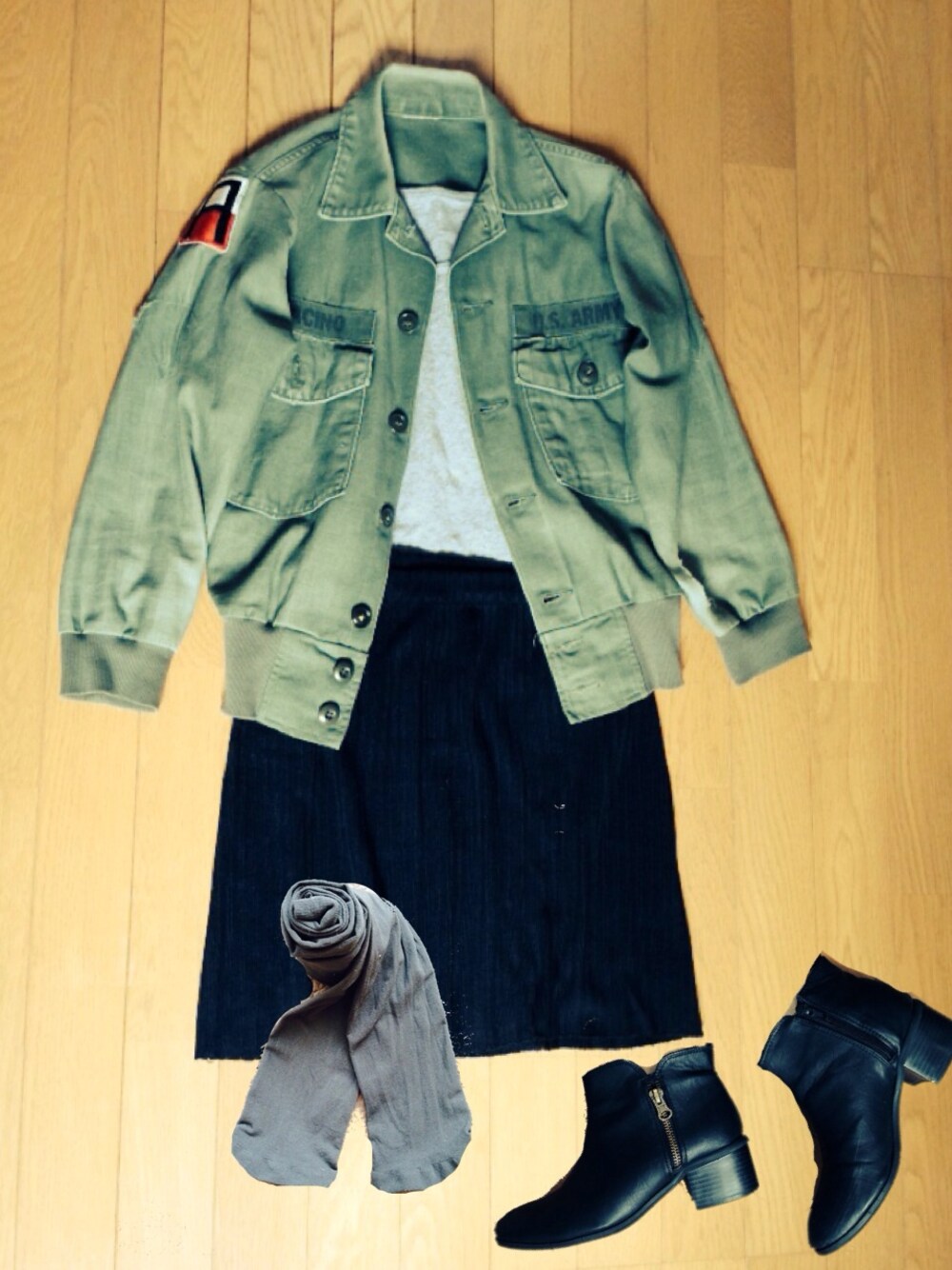 ミリタリージャケット 古着 グレーTシャツ ユニクロ ニットスカート 古着