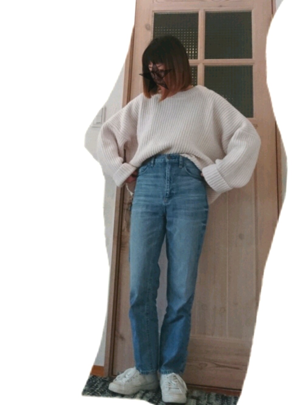 ホワイト系のニット/セーター、ブルー系のデニムパンツ、ホワイト系のスニーカーを着用したレディースの冬コーディネートの1枚目の写真