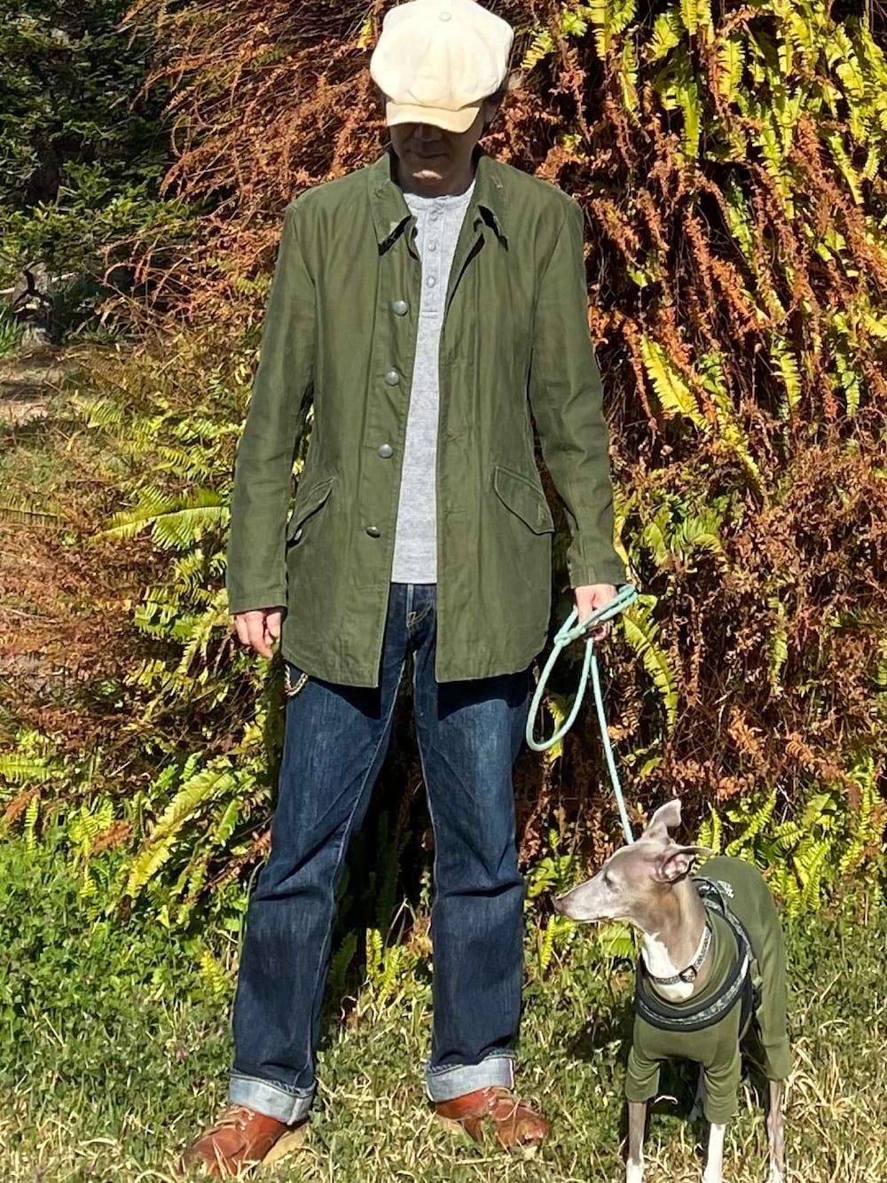カーキペアコーデでお散歩〜笑笑 ワンコもグレーだからインナーもグレーで😁 redwing8875はもう20歳超えてる相棒。 70sのスウェーデン軍ものの 腰のとこ絞られてて面白いカタチの ミリタリーフィールドジャケットは ちと今日昼間の散歩には暑かった…