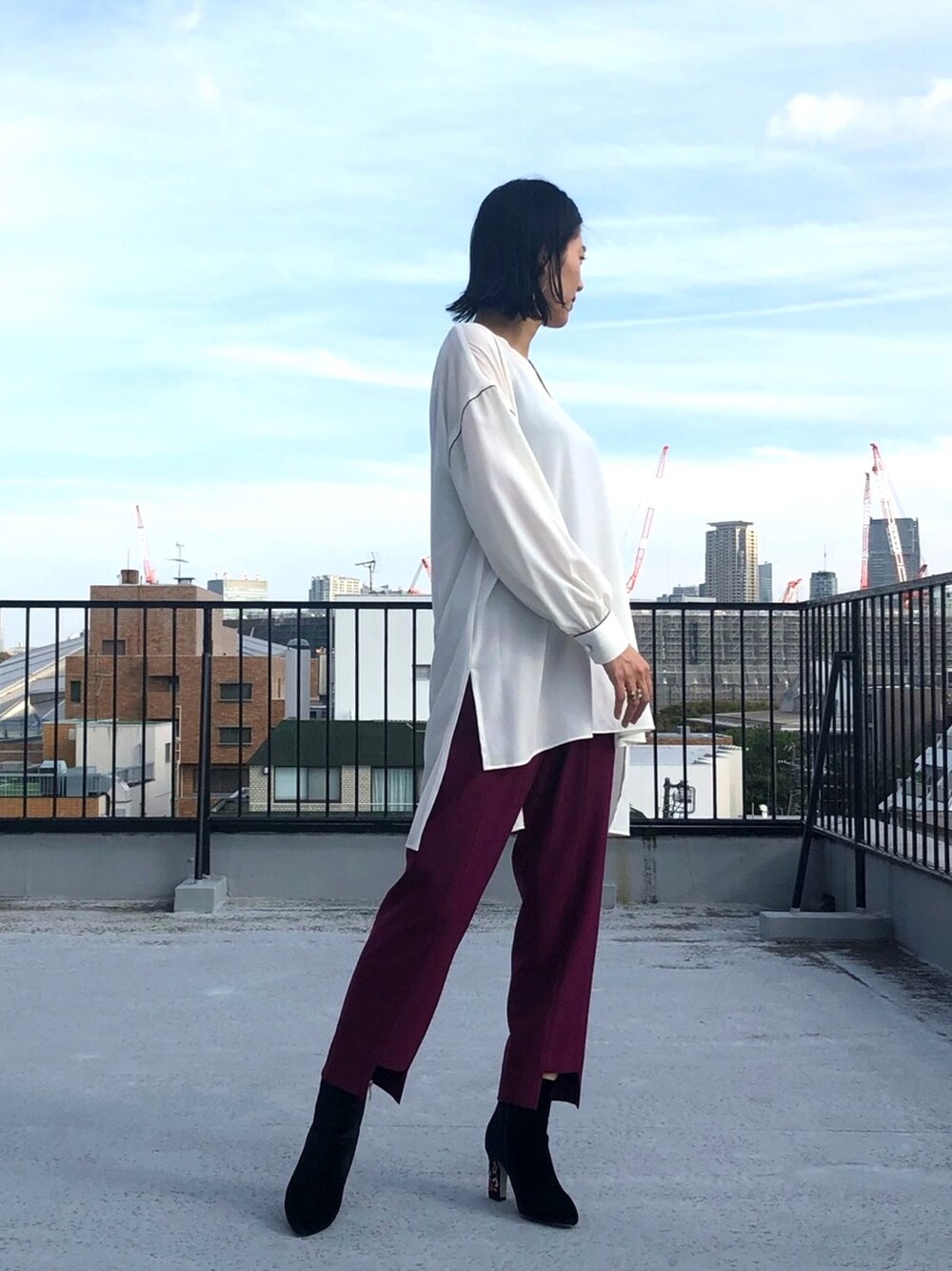 リラックス感のあるスタイリングです。 ヒップまであるブラウスにテーパードのカラーパンツでメリハリを。