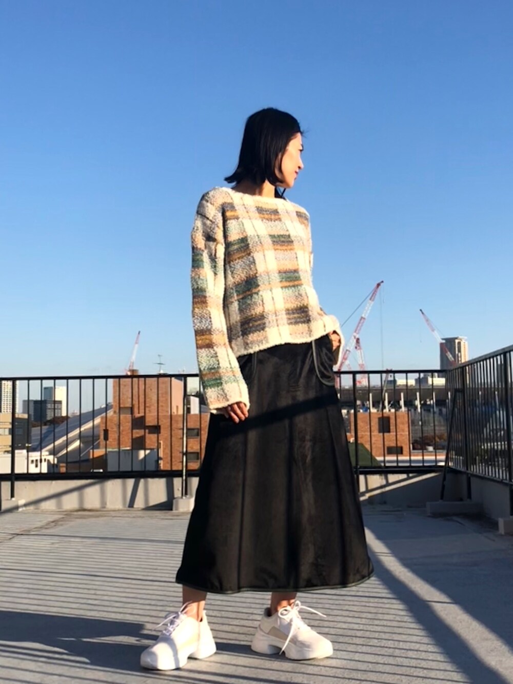 チェックのふわっと軽いニット&ハリ感のあるボックススカートを着用しています。 ニットのベルスリーブがかわいいポイントです。