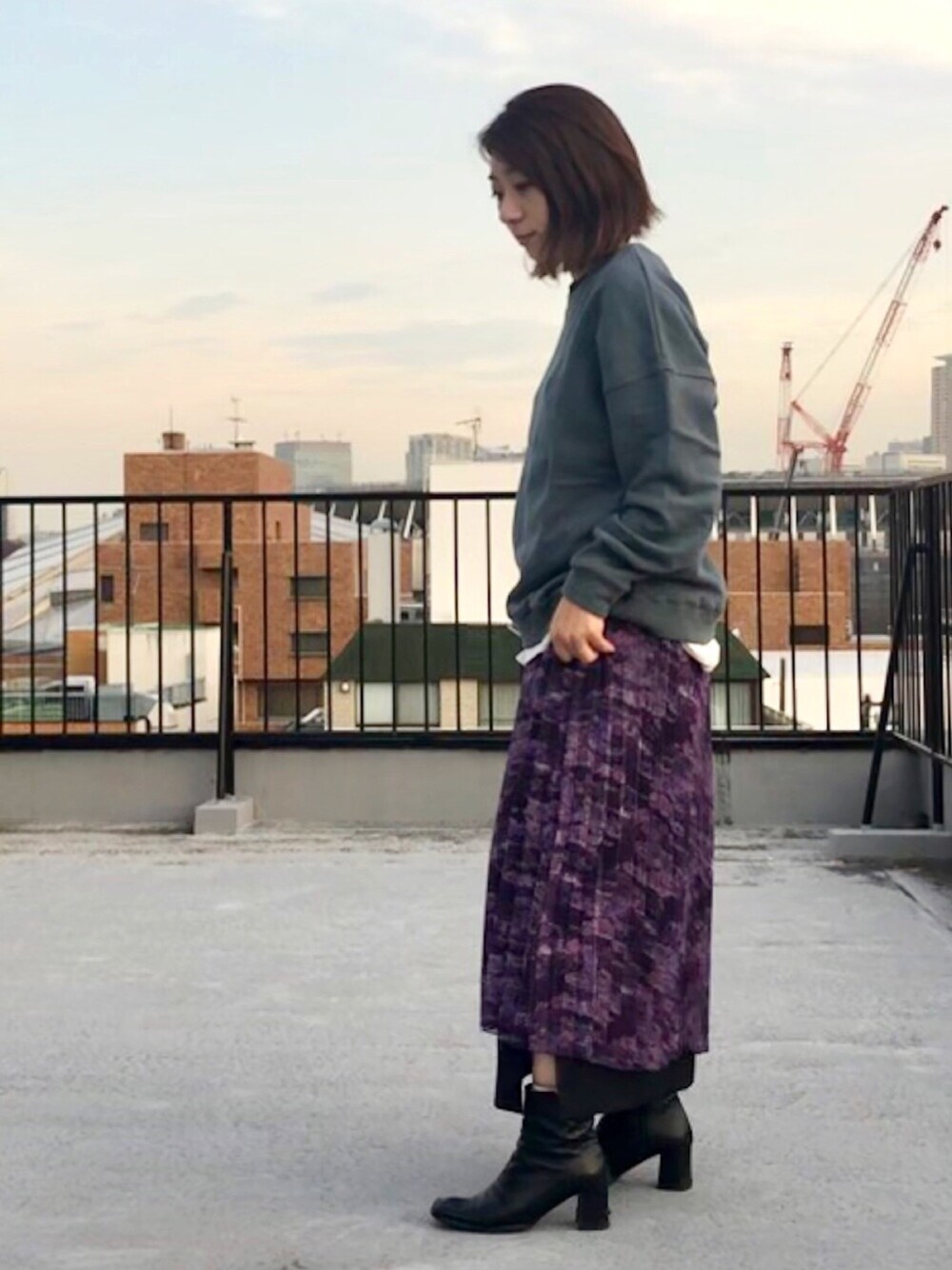 コートの中身のコーデ。 微妙な色感のブルースウェットがめずらしくてお気に入り。 パープルのスカートはCIROIオリジナル柄で気分が上がります。