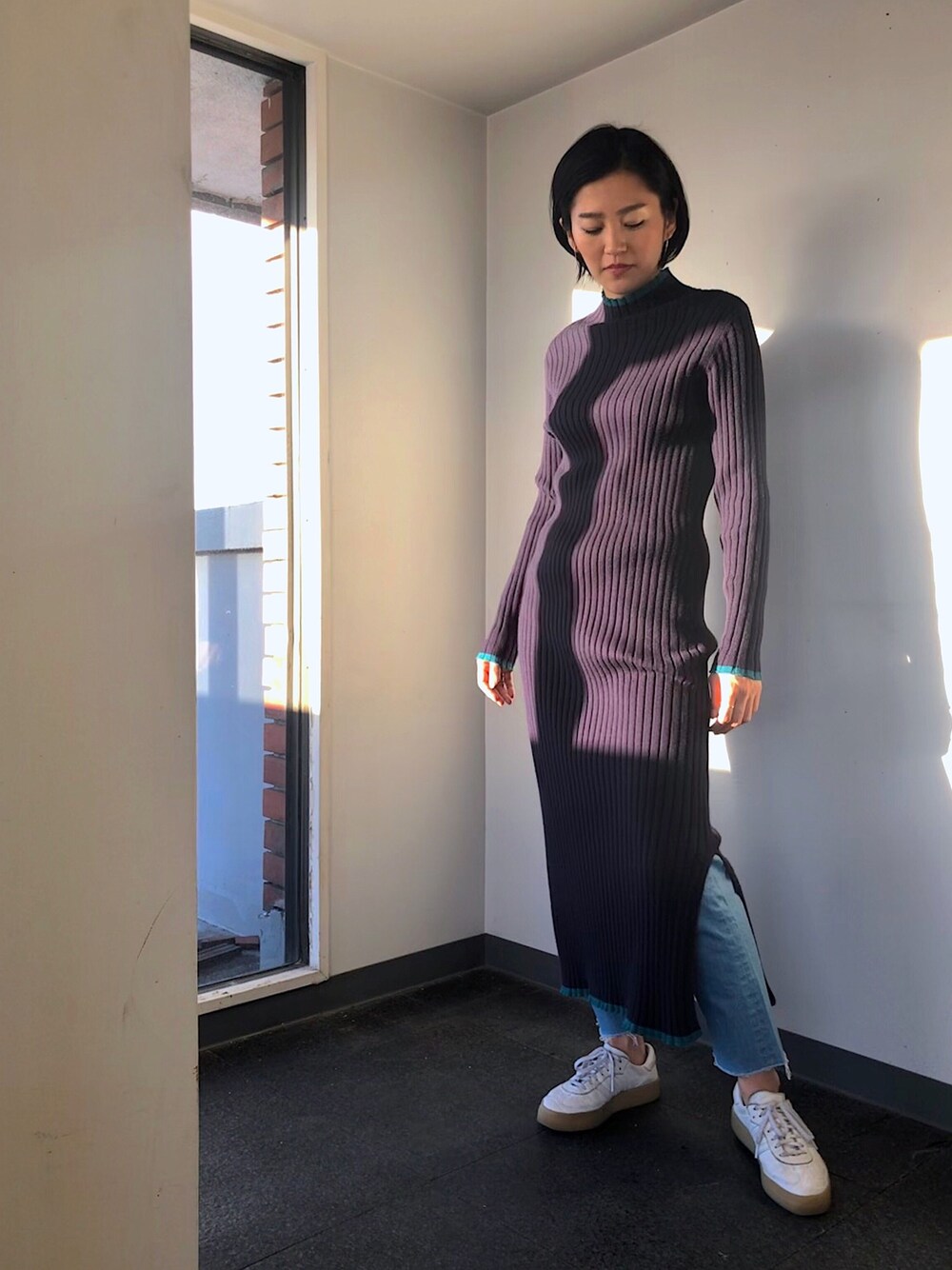 すらっと縦長に見えるリブワンピ。 スリットから覗くボトムでコーデが楽しくなります。