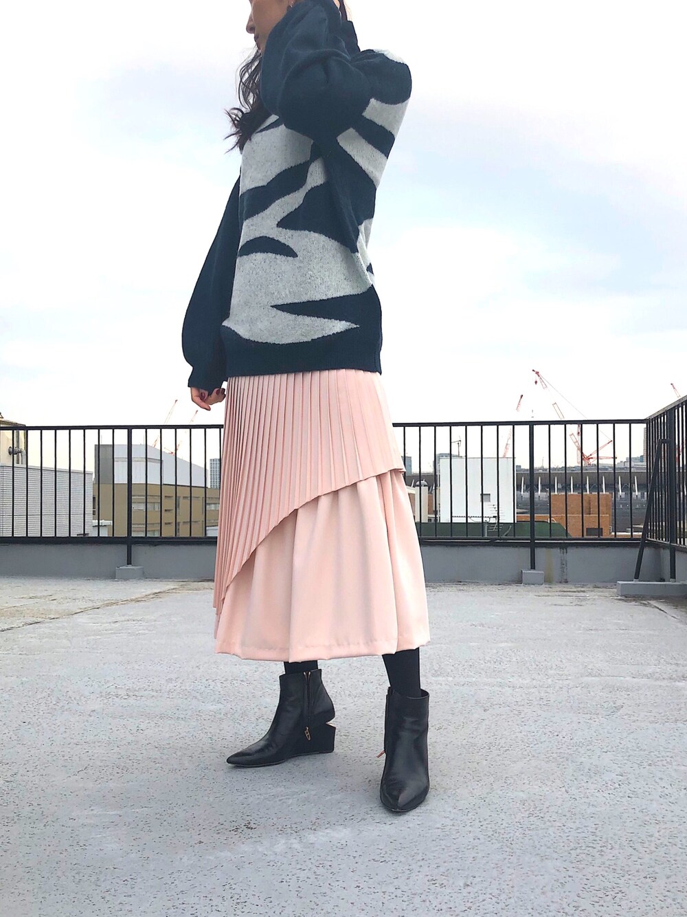 春色スカートを取り入れたコーデ。 まだまだ寒いので、ビッグサイズのゼブラニットと合わせて。