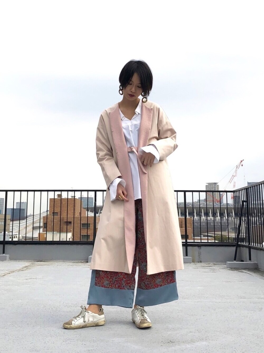 ロングコートの裾からさりげなく柄パンツを覗かせました。 キレイめコーデにパンツとスニーカーを合わせてオトナカジュアルに仕上げました。