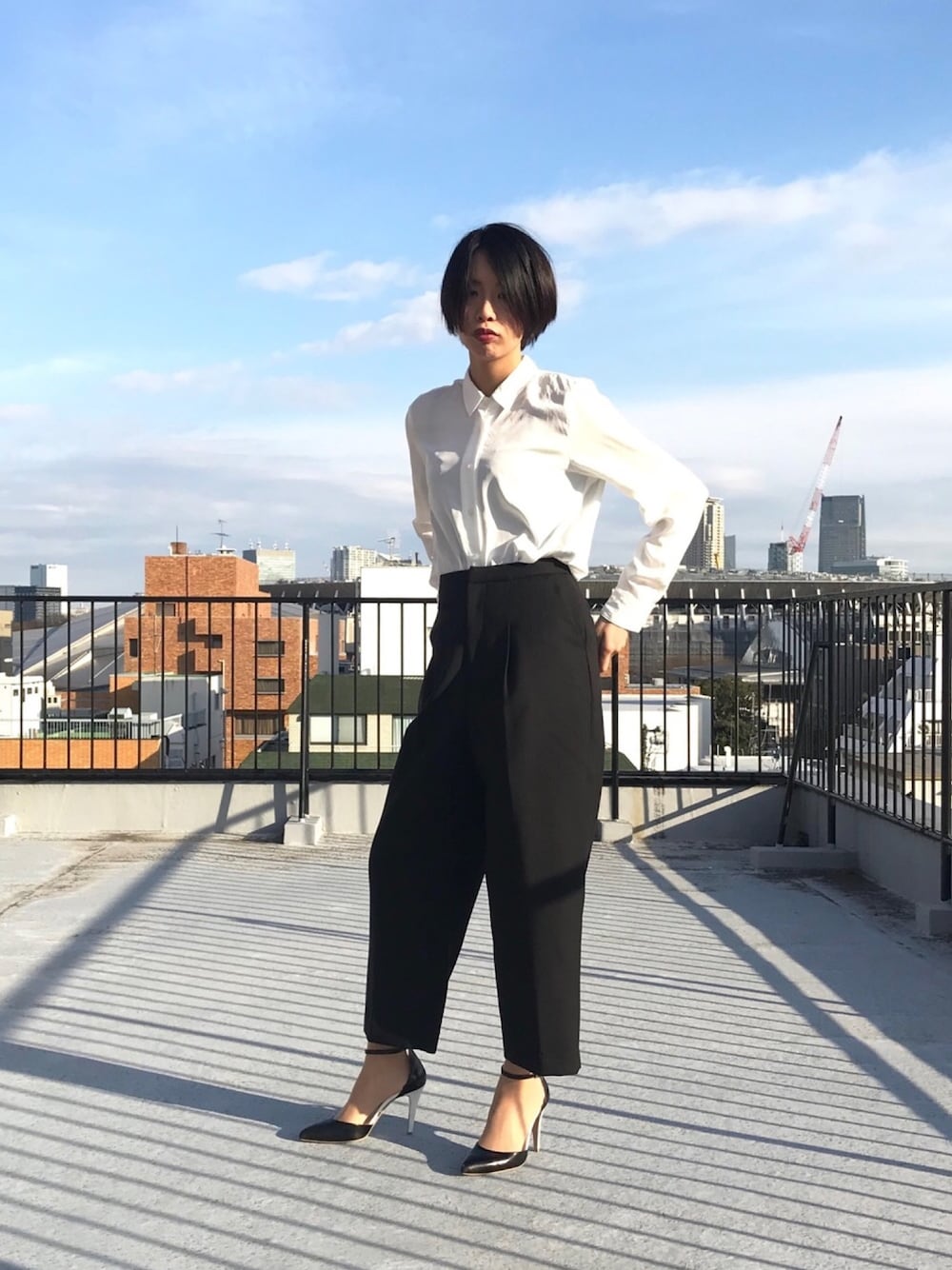 とろみのあるシャツにクロップドパンツを合わせたシンプルスタイル。 ジャケットや小物で個性を出せるコーディネートです。