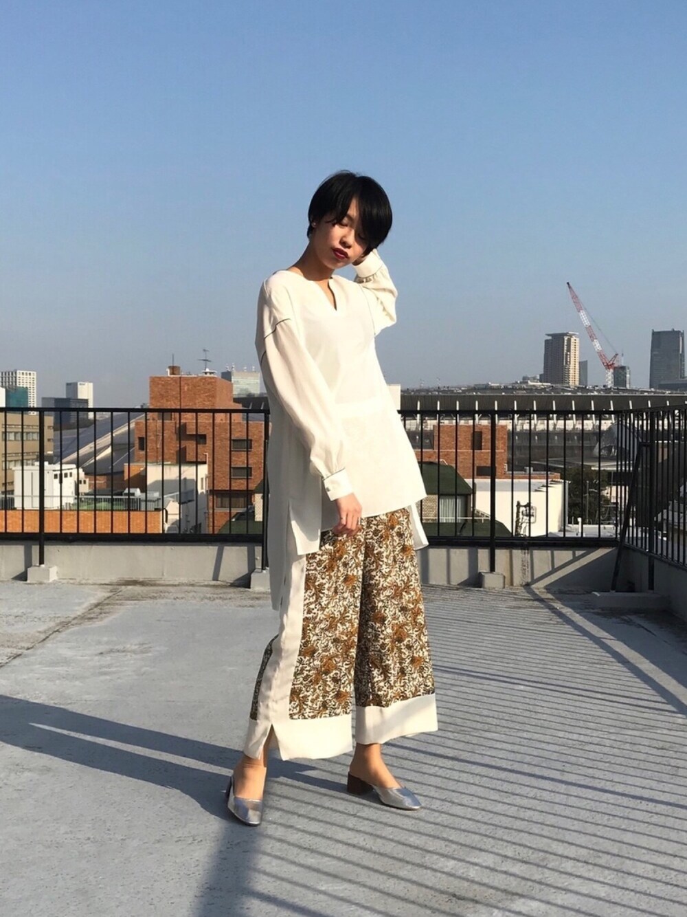 チュニック丈のブラウスと柄のゆるっとパンツで、 春のリラックススタイル。 どちらも落ち感のある素材で、ゆったり着こなせます