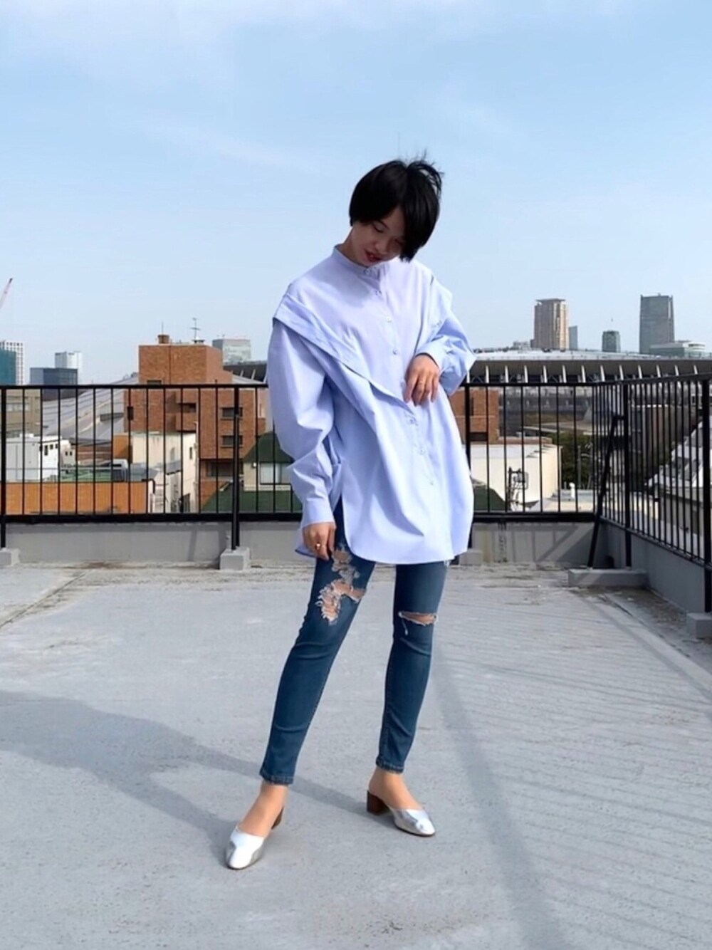 1枚でシャツをレイヤードしているようなマジックシャツ。 きちんとスタンドカラーなのに抜かして着ているような 抜け感のあるコーディネートが叶います。