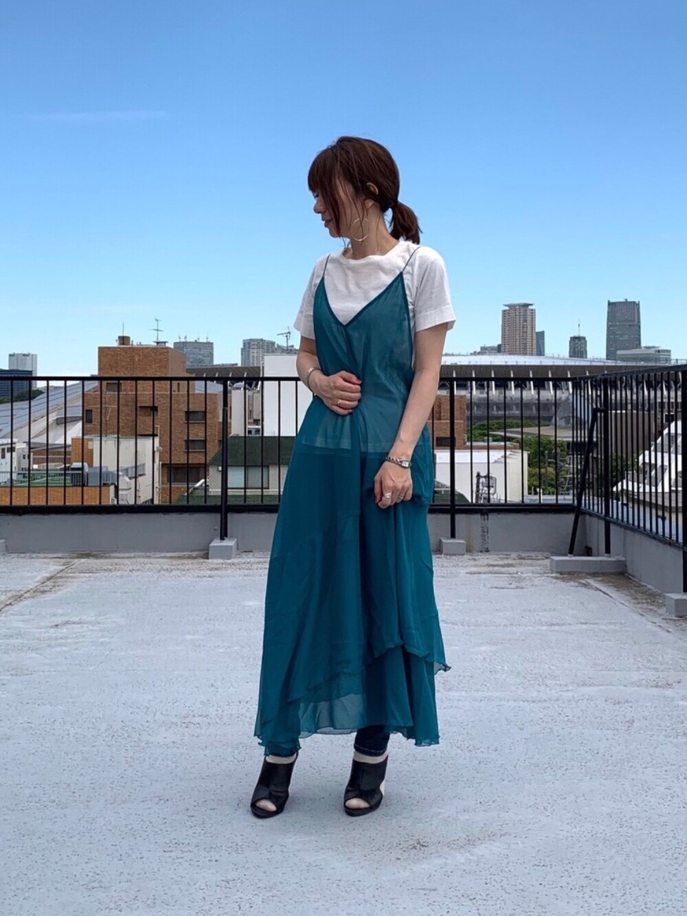 透け感のあるキャミワンピにはTシャツとデニムを合わせて シンプルなコーディネートにポイントを