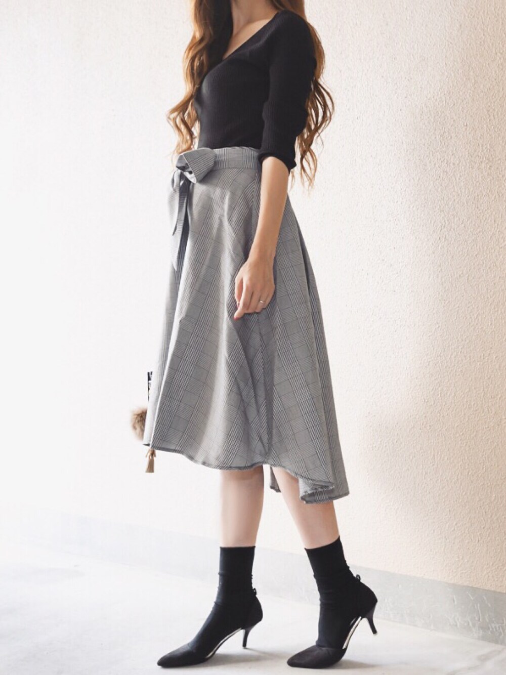 ブラック系のスカートを着用したレディースの秋コーディネートの1枚目の写真