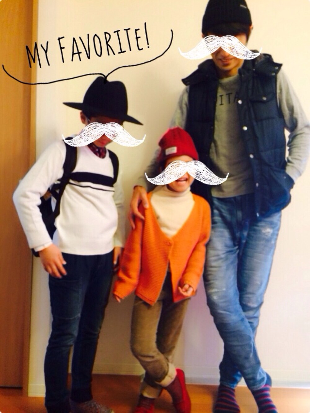 息子ちゃんのニット、ママが買った福袋の中に入ってたもの😊😊きせちゃいました😍😍三人で、パシャリ。😁😁