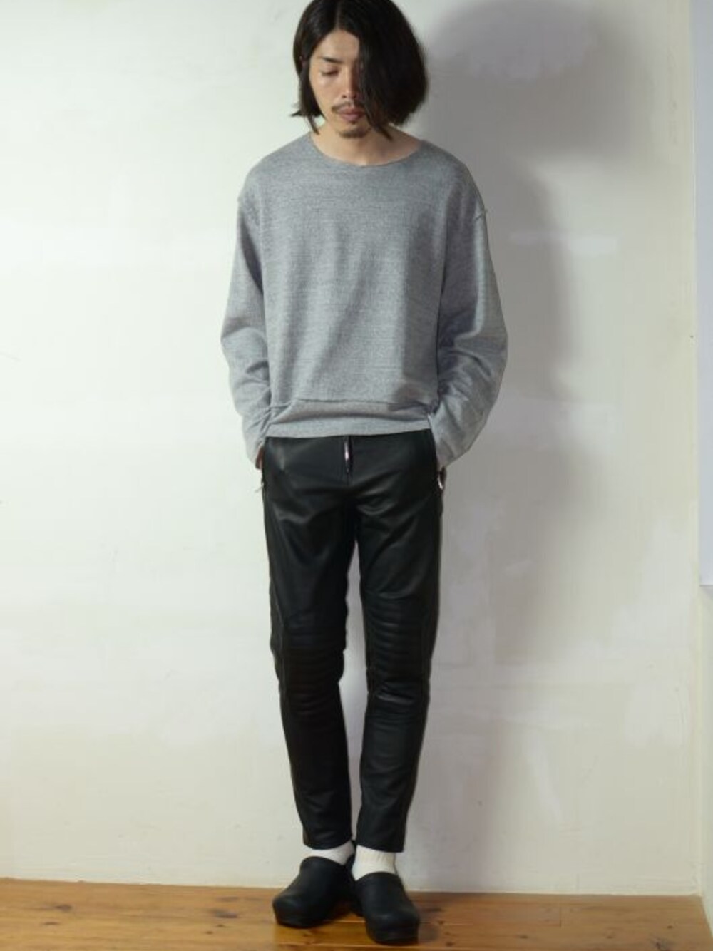 レザーパンツを中心としたモノトーンコーディネイト。 一見するとハードなレザーパンツですが、 テーパードのシルエットはもちろん、バランスに変化をもたせて馴染ませています。