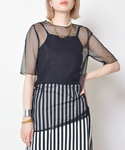 カットソーとタンクトップ、パンツのスタイルです。 モードに大人っぽく、抜け感のあるオールブラックコーデです。