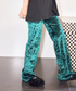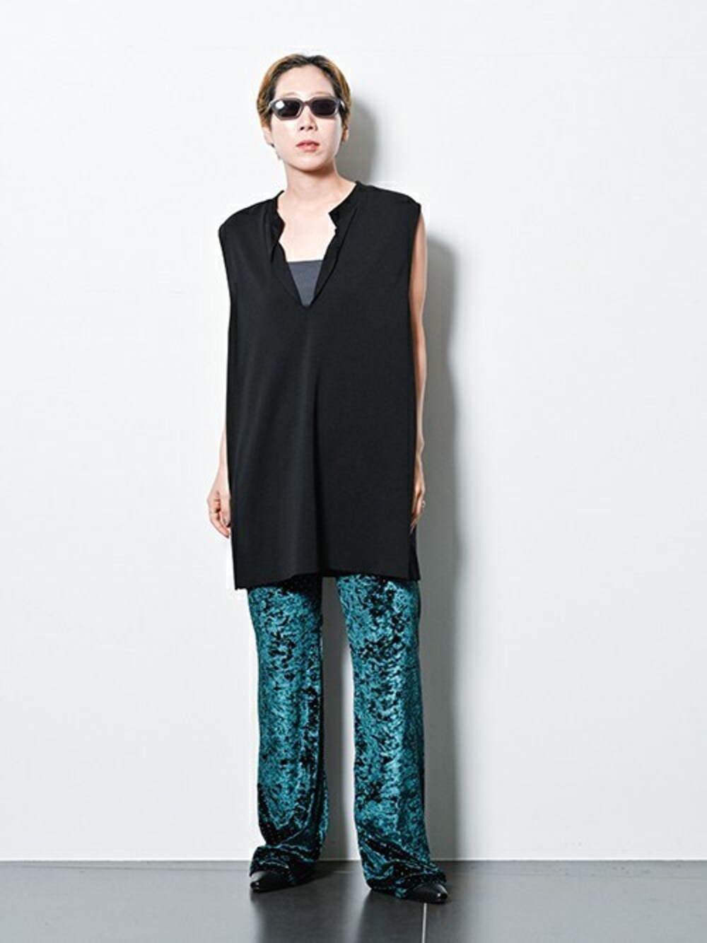 ゆるっとしたノースリーブのTシャツに、ベロア素材のボトムを合わせて少しだけ秋を取り入れて。 クラッシュベルベッドのパンツは、小さめのスタッズが付いており、シンプルなトップスにサラリと合わせるだけでもアクセントになってくれます。