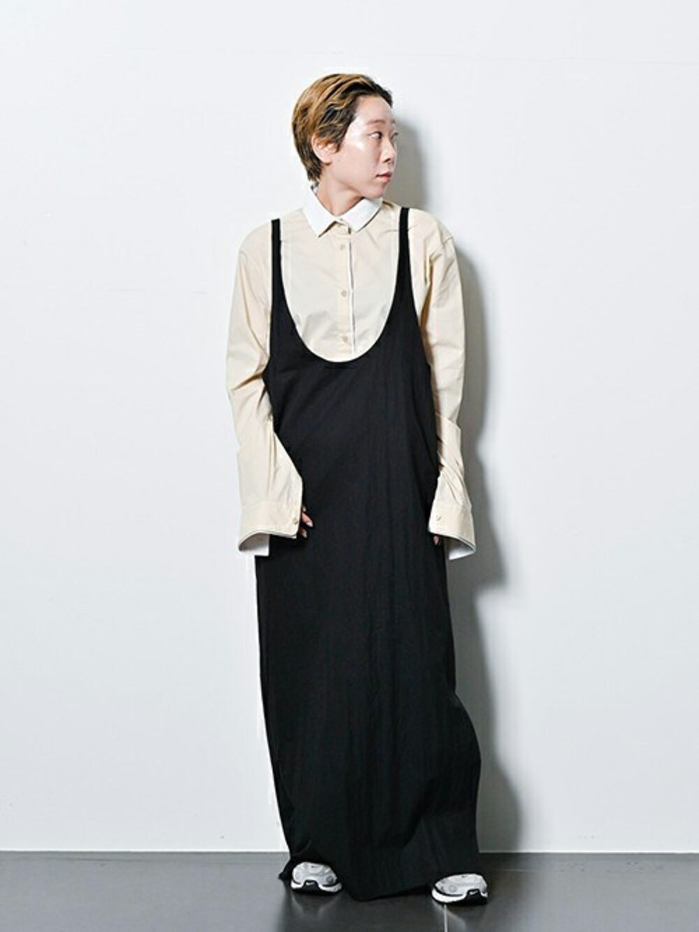MIRCOのイタリアンシャツは縦長のシャープな印象が特徴的です。 OPOSSITEのシンプルながらもデザインに個性を感じるドレスを合わせてミニマムなモードスタイルにしました。 かっちり感が強いときはスニーカーでバランスをとります!