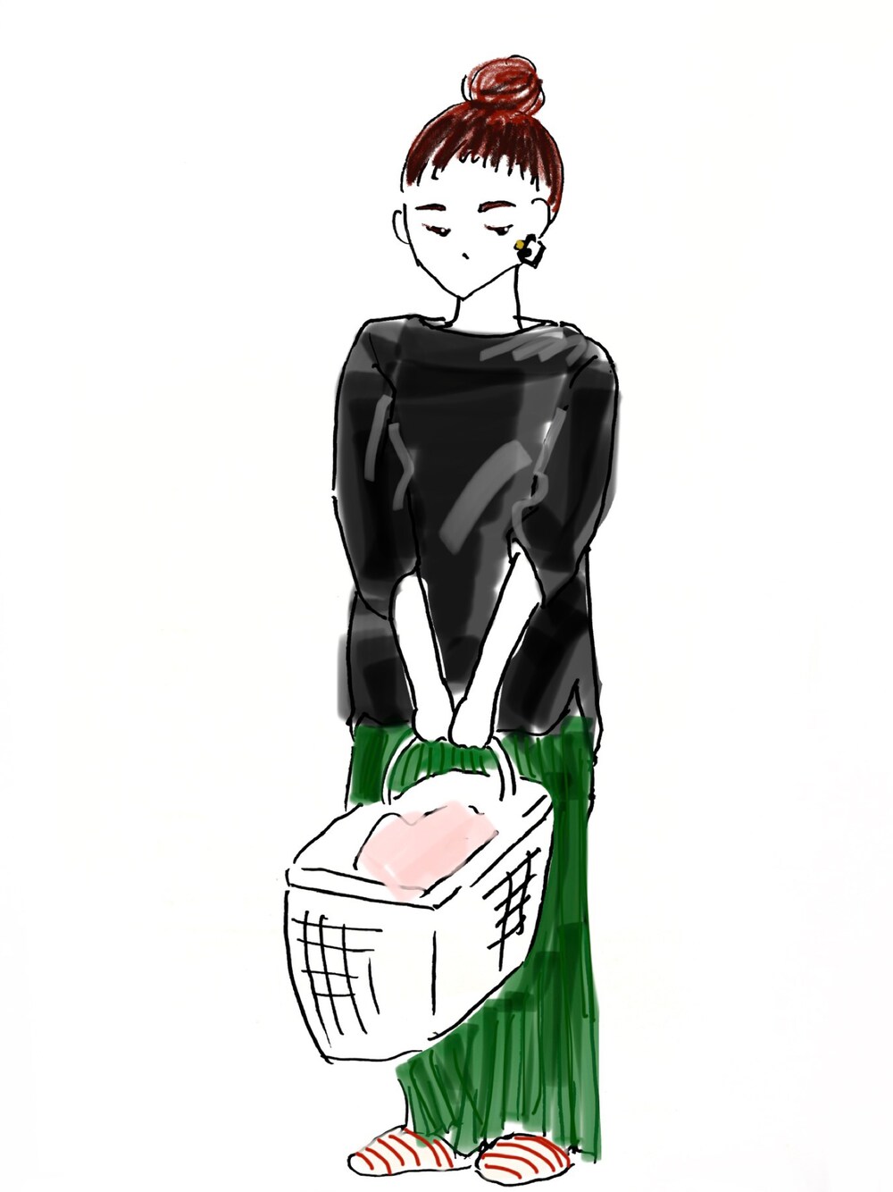 洗濯物干しスタイル 在宅ワークでも 気分を上げるために フルメイク・フル装備。 スコットクラブで新調したグリーンのパンツは 鮮やかでパッと映える色。 夏には重たい黒のトップス。 でも素材が軽いからさらりと着られる。 セールで色違いの黒・白購入。 合わせやすいから、重宝してます。