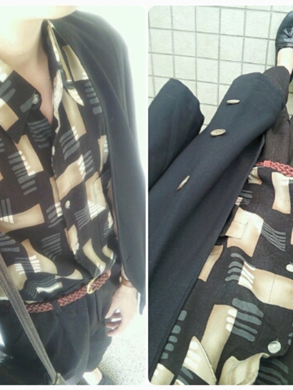 素材、色味合わせ。 レーヨンのシャツをタックイン。 レーヨン混のノーカラージャケットを羽織って ツータックの黒のストライプ柄テーパードスラックス タッセルローファーで黒ハットでハメきる。 全て古着。