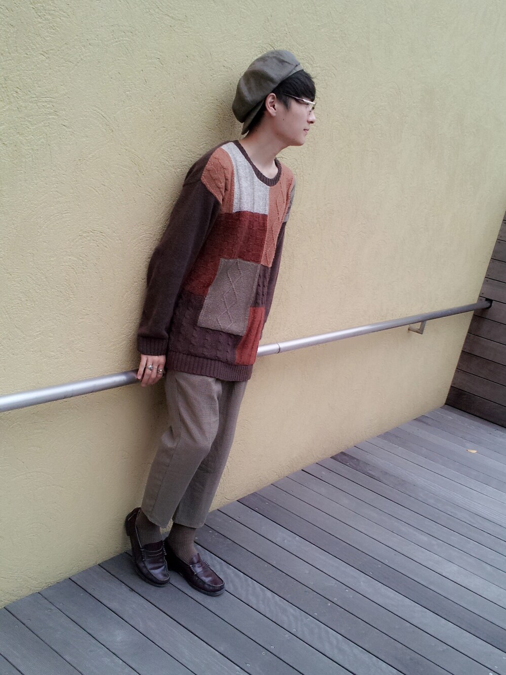 オーバーサイズの珍しいニット一枚が主役 カーキの千鳥格子のテーパードスラックスと 赤茶の丸眼鏡で色味合わせと抜け感を 靴下もニットの色味と近付けて 赤茶のローファーで締める キャスケットを被ってストーリー性をプラス ヴィンテージのリングは外せない 全て原宿のセバスチャンで購入