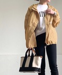 ベージュ系のマウンテンパーカーを着用したレディースの春コーディネートの1枚目の写真