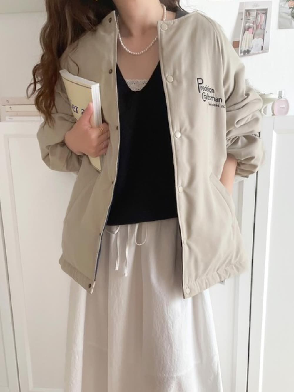 classicalelfクラシカルエルフのブルゾン「《JAVAジャバ 別注》ロゴ刺繍中綿ノーカラーオーバーサイズブルゾン」を使ったコーディネート