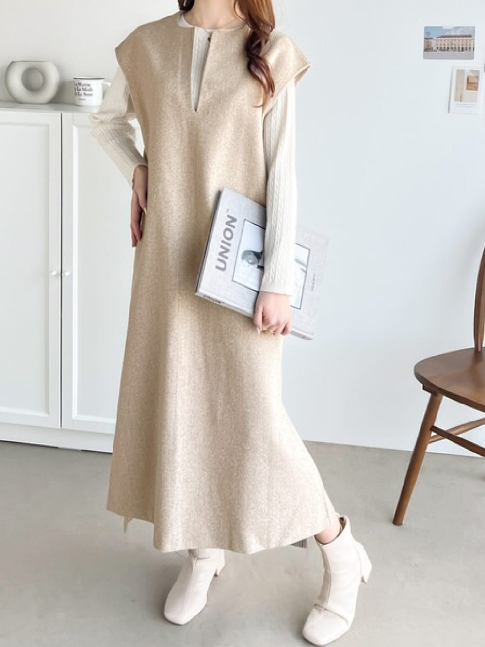 classicalelfクラシカルエルフ(Classical Elf ZOZOTOWN)のワンピース「1枚で主役級。冬に大活躍!カフタン調サイドスリット圧縮ニットロング丈ジャンパースカート」を使ったコーディネート