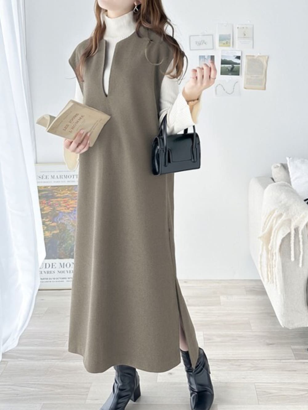 classicalelfクラシカルエルフ(Classical Elf ZOZOTOWN)のワンピース「1枚で主役級。冬に大活躍!カフタン調サイドスリット圧縮ニットロング丈ジャンパースカート」を使ったコーディネート