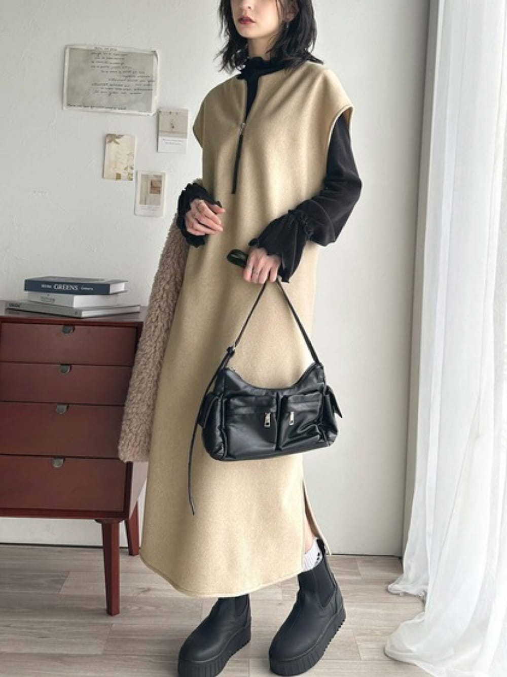 classicalelfクラシカルエルフのワンピース「1枚で着回し力抜群。前後2wayフェイクウール素材ハーフジップワンピース」を使ったコーディネート