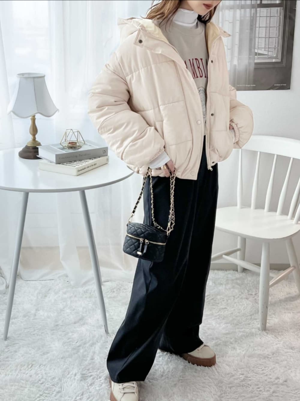 classicalelfクラシカルエルフのダウンジャケット/コート「《JaVa ジャバコラボ》 ぬくぬく暖か! ショート丈 フード付き 中綿 フェイク ダウン コート」を使ったコーディネート