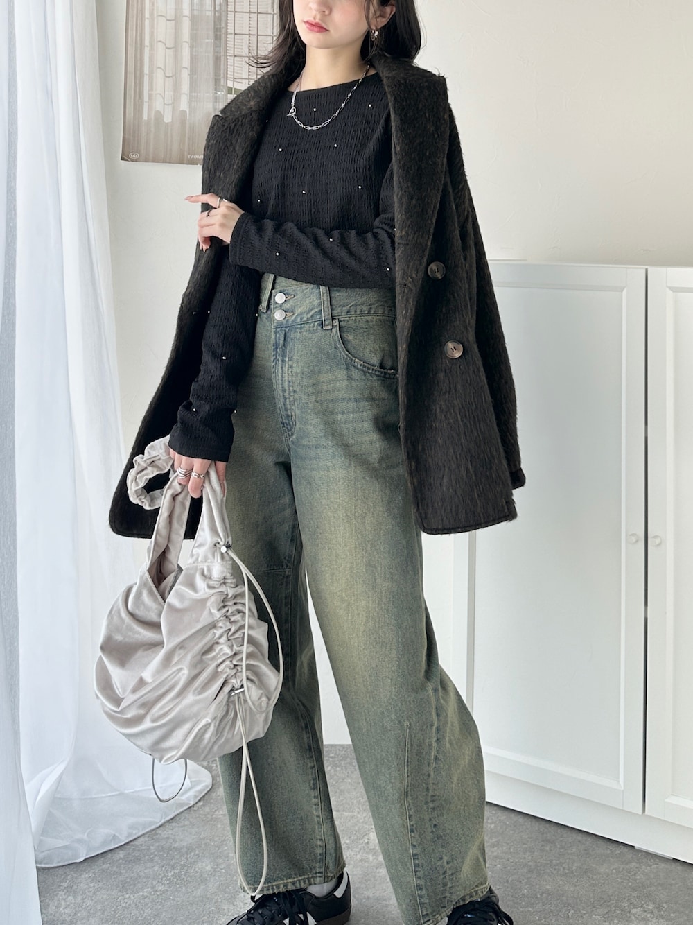 classicalelfクラシカルエルフのTシャツ/カットソー「程よい甘さが可愛い。ビジュードットが煌めくシャーリング風長袖トップス」を使ったコーディネート