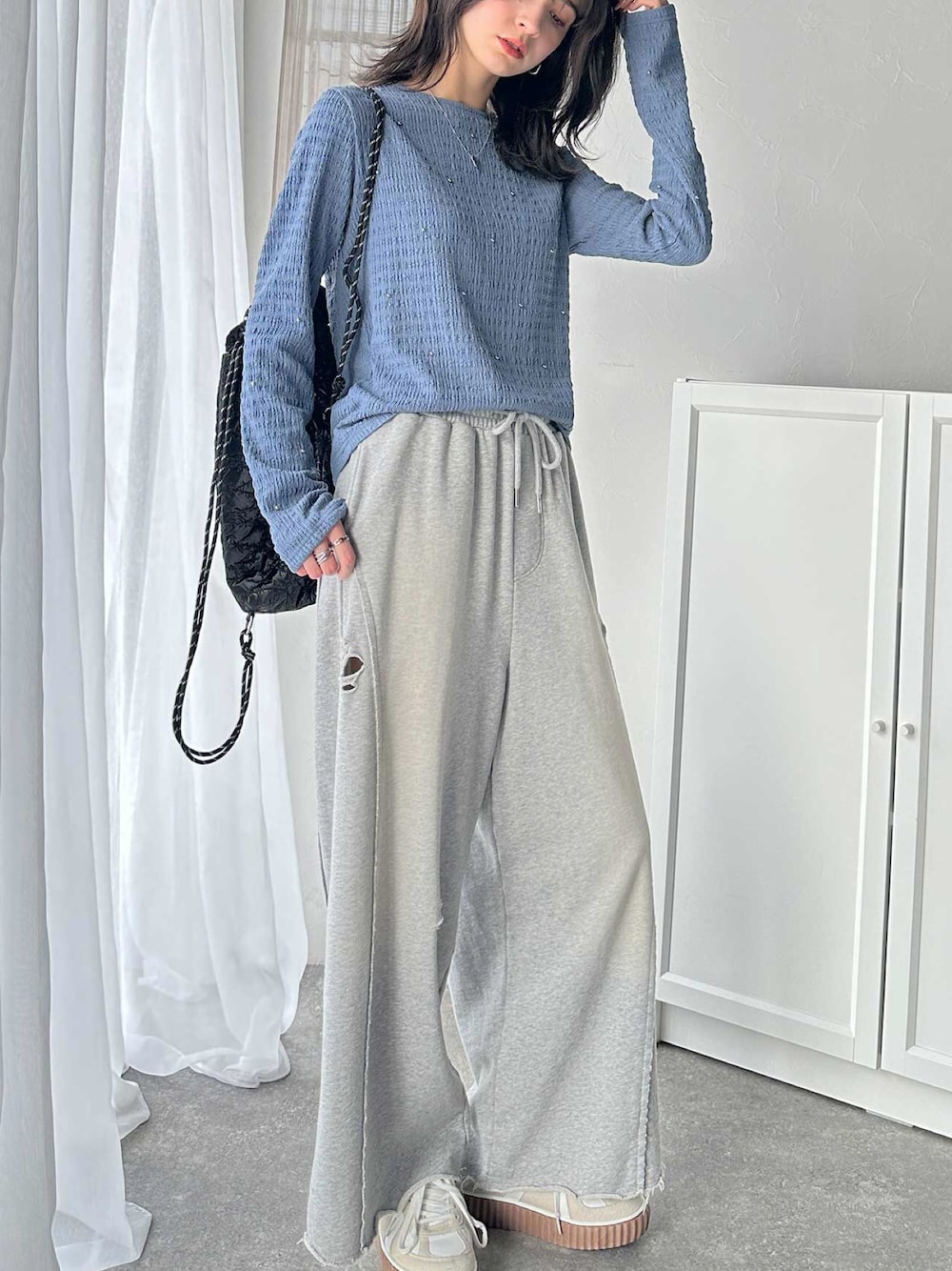 classicalelfクラシカルエルフのTシャツ/カットソー「程よい甘さが可愛い。ビジュードットが煌めくシャーリング風長袖トップス」を使ったコーディネート