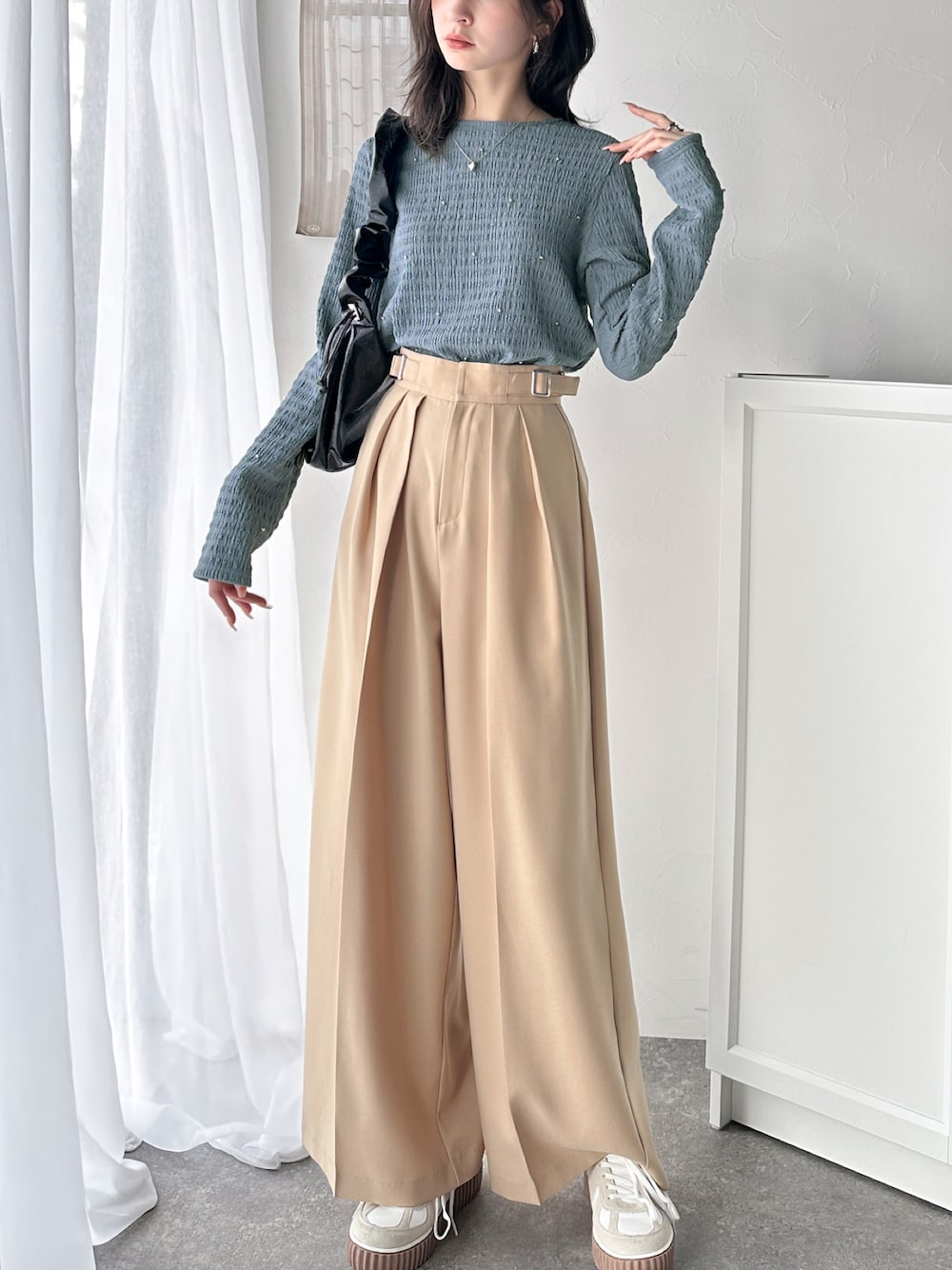 classicalelfクラシカルエルフのTシャツ/カットソー「程よい甘さが可愛い。ビジュードットが煌めくシャーリング風長袖トップス」を使ったコーディネート