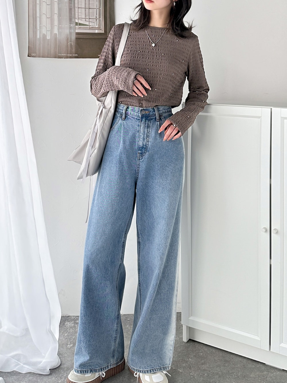 classicalelfクラシカルエルフのTシャツ/カットソー「程よい甘さが可愛い。ビジュードットが煌めくシャーリング風長袖トップス」を使ったコーディネート