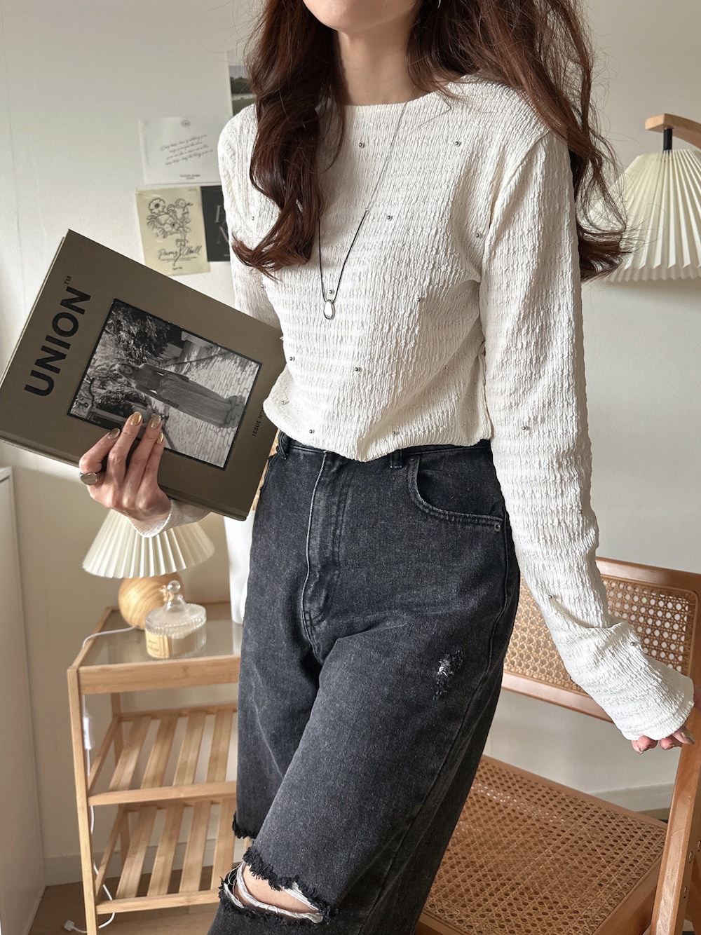 classicalelfクラシカルエルフのTシャツ/カットソー「程よい甘さが可愛い。ビジュードットが煌めくシャーリング風長袖トップス」を使ったコーディネート