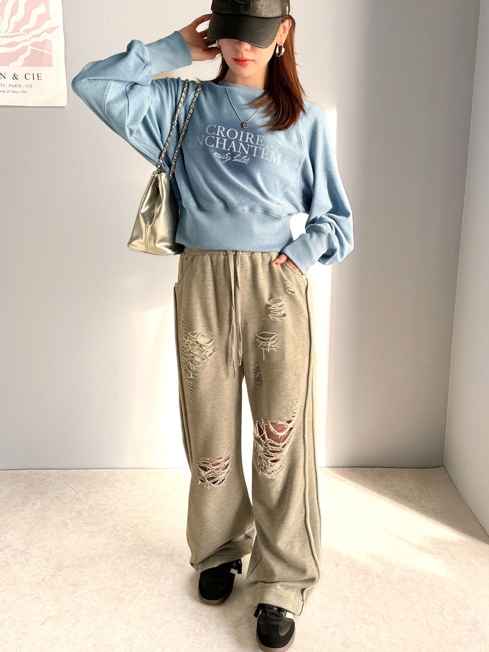 classicalelfクラシカルエルフのスウェット「【mily bilet】カジュアルだけどこなれ感たっぷり。ラインストーン&ぼかしプリント裏毛使いスウェットクロップド丈トップス」を使ったコーディネート