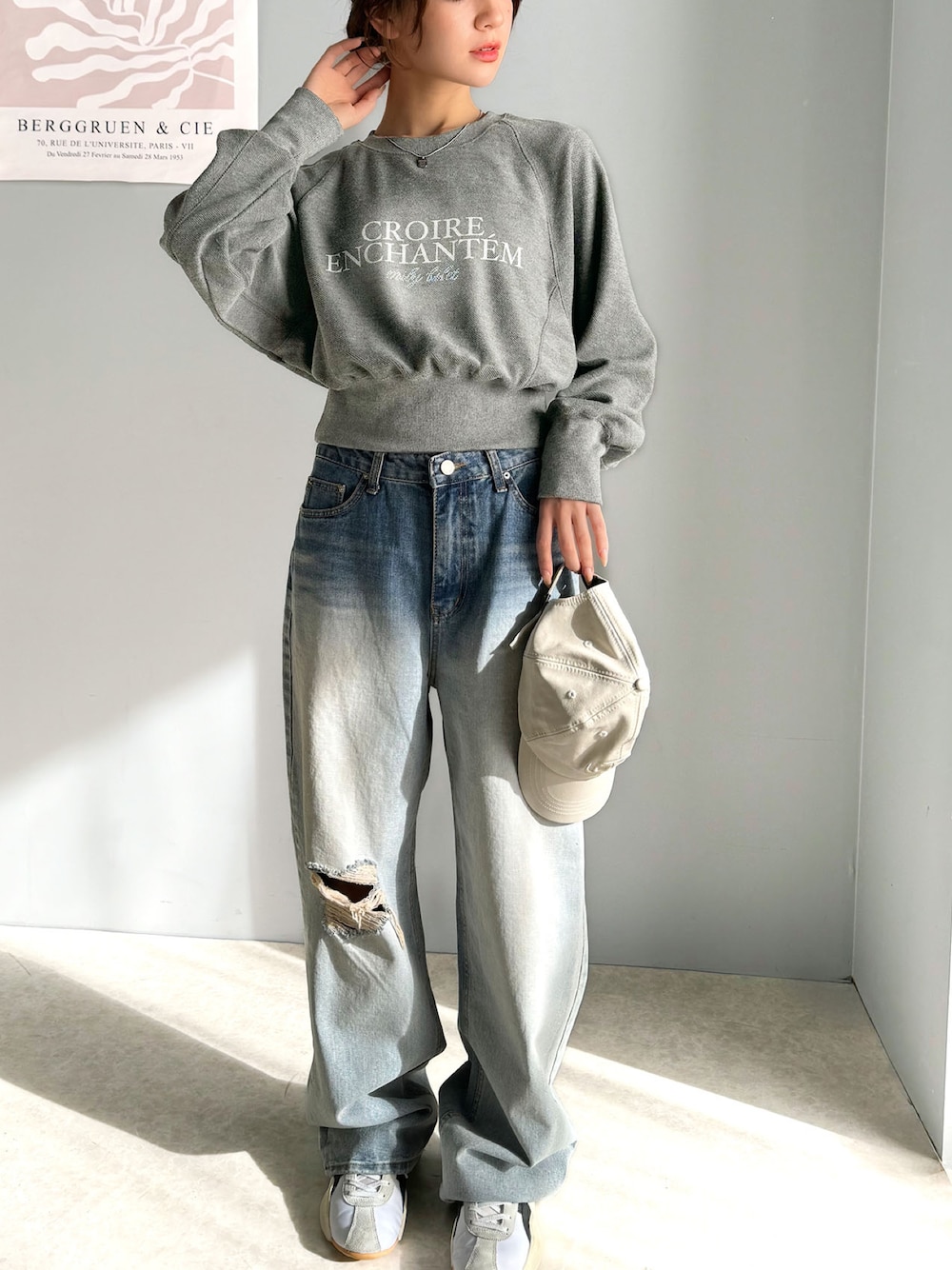 classicalelfクラシカルエルフのスウェット「【mily bilet】カジュアルだけどこなれ感たっぷり。ラインストーン&ぼかしプリント裏毛使いスウェットクロップド丈トップス」を使ったコーディネート