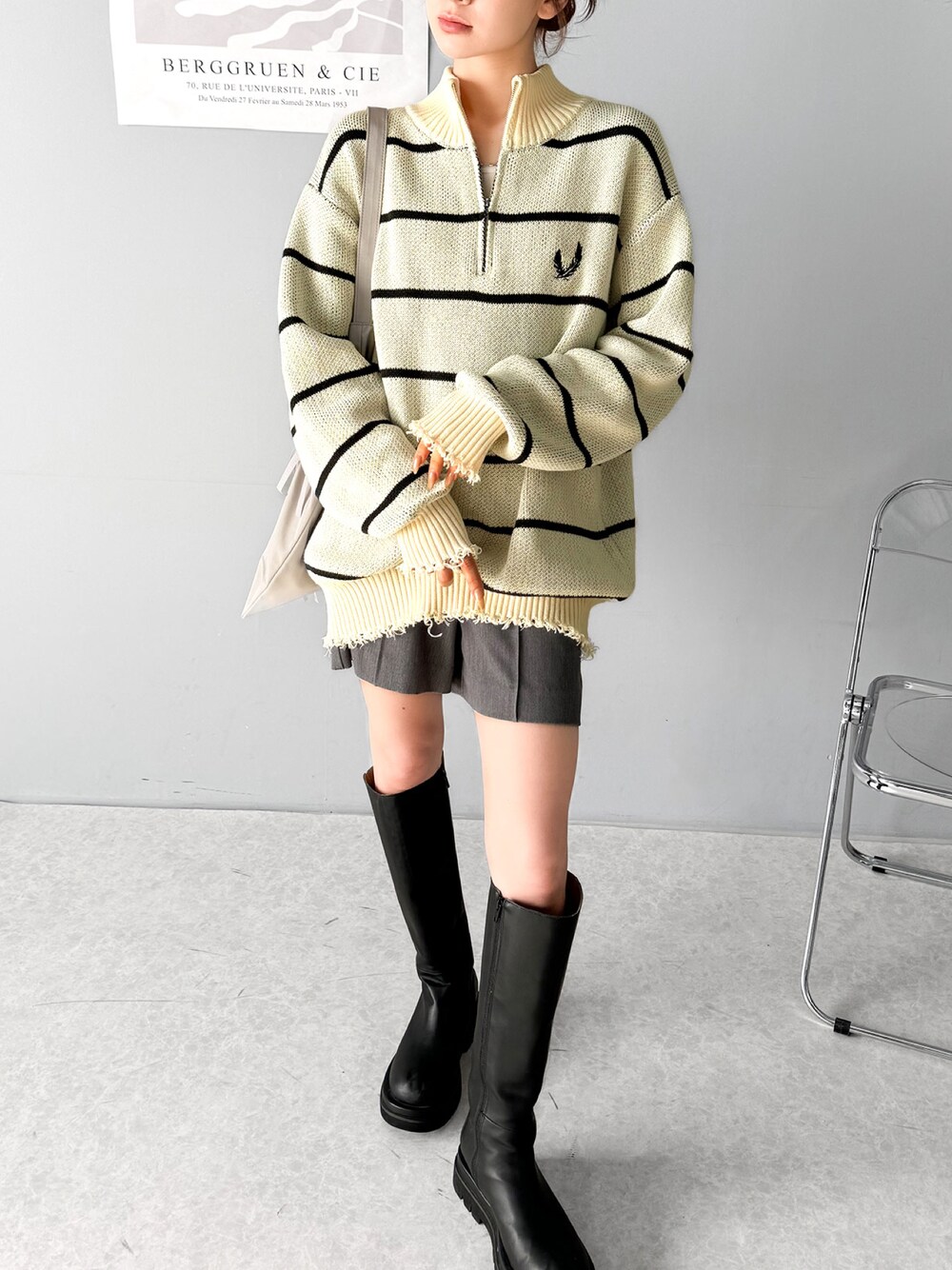 classicalelfクラシカルエルフのニット/セーター「【mily bilet】こなれ感のある大人カジュアルが完成。ハーフジップクラッシュ加工ボーダープルオーバー(ニット)」を使ったコーディネート
