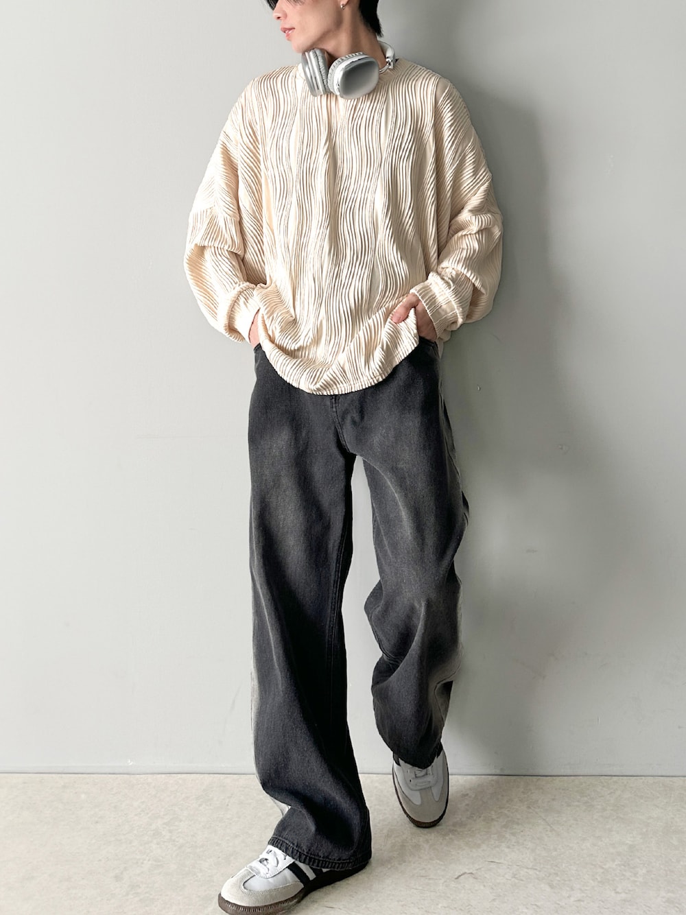 classicalelfクラシカルエルフ(Classical Elf ZOZOTOWN)のTシャツ/カットソー「ゆるさとスタイリッシュを両立。オーバーサイズウェーブ柄ジャガード長袖Tシャツ」を使ったコーディネート